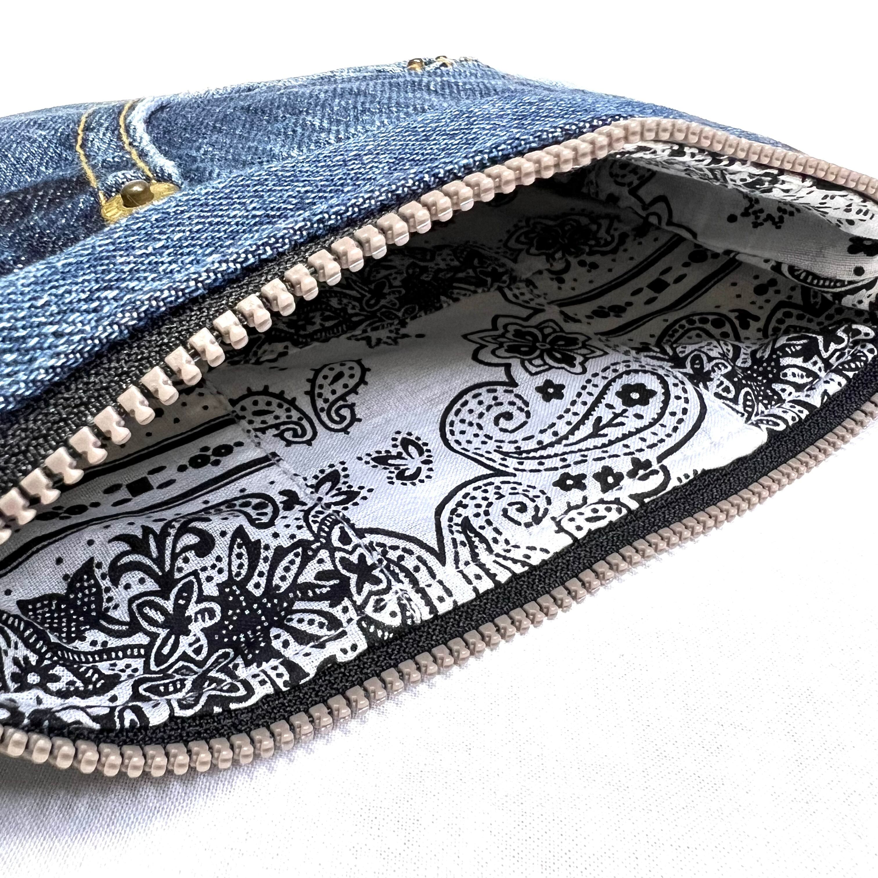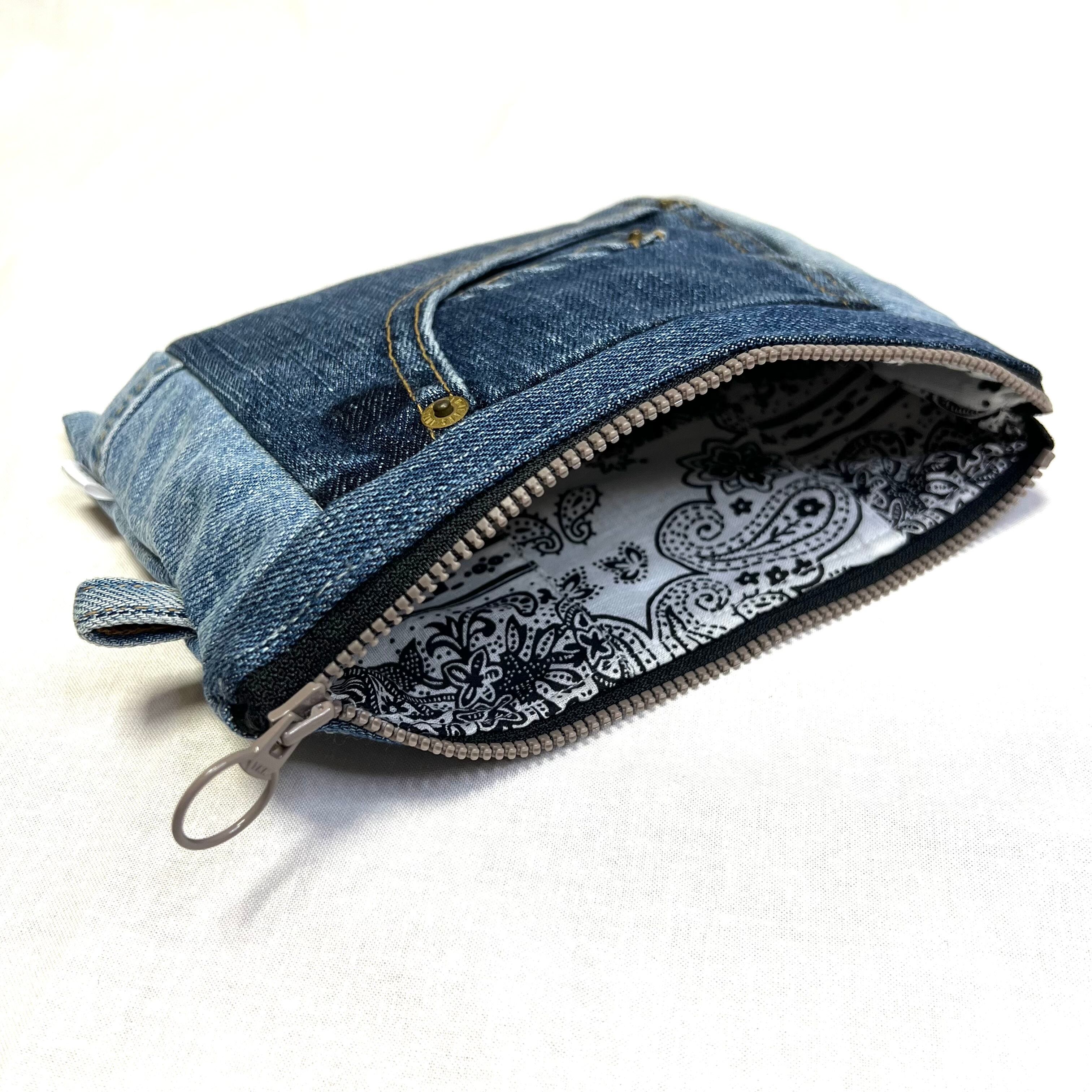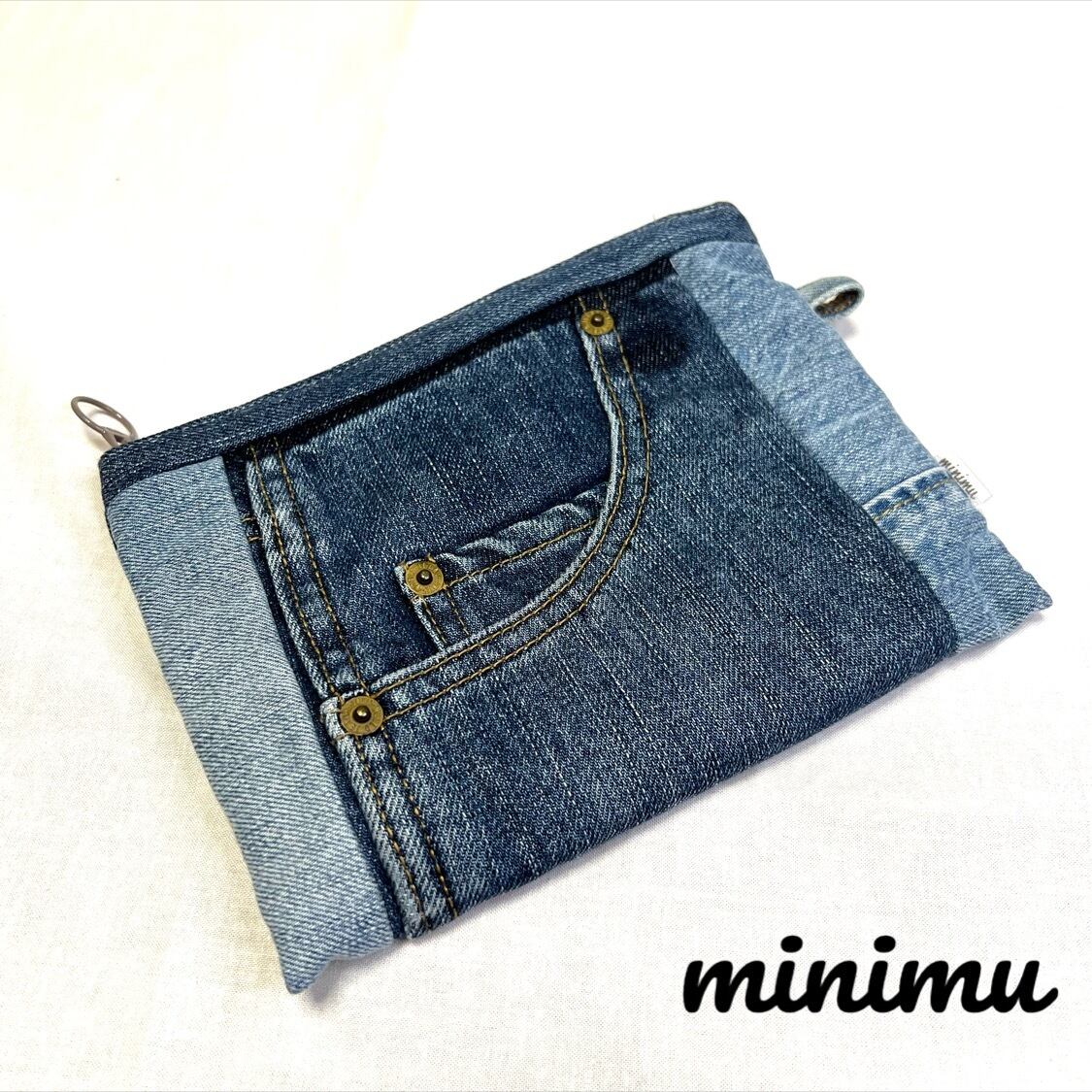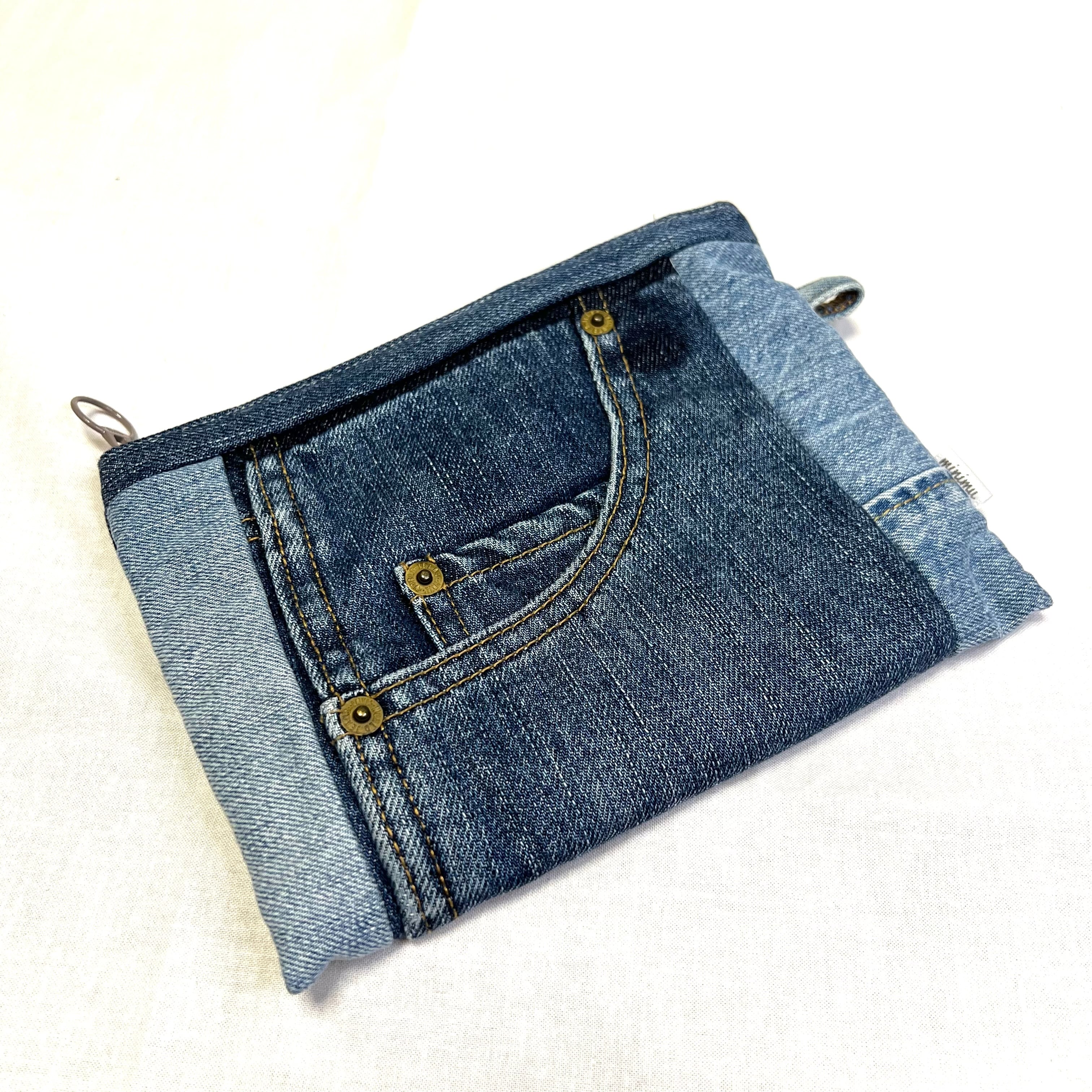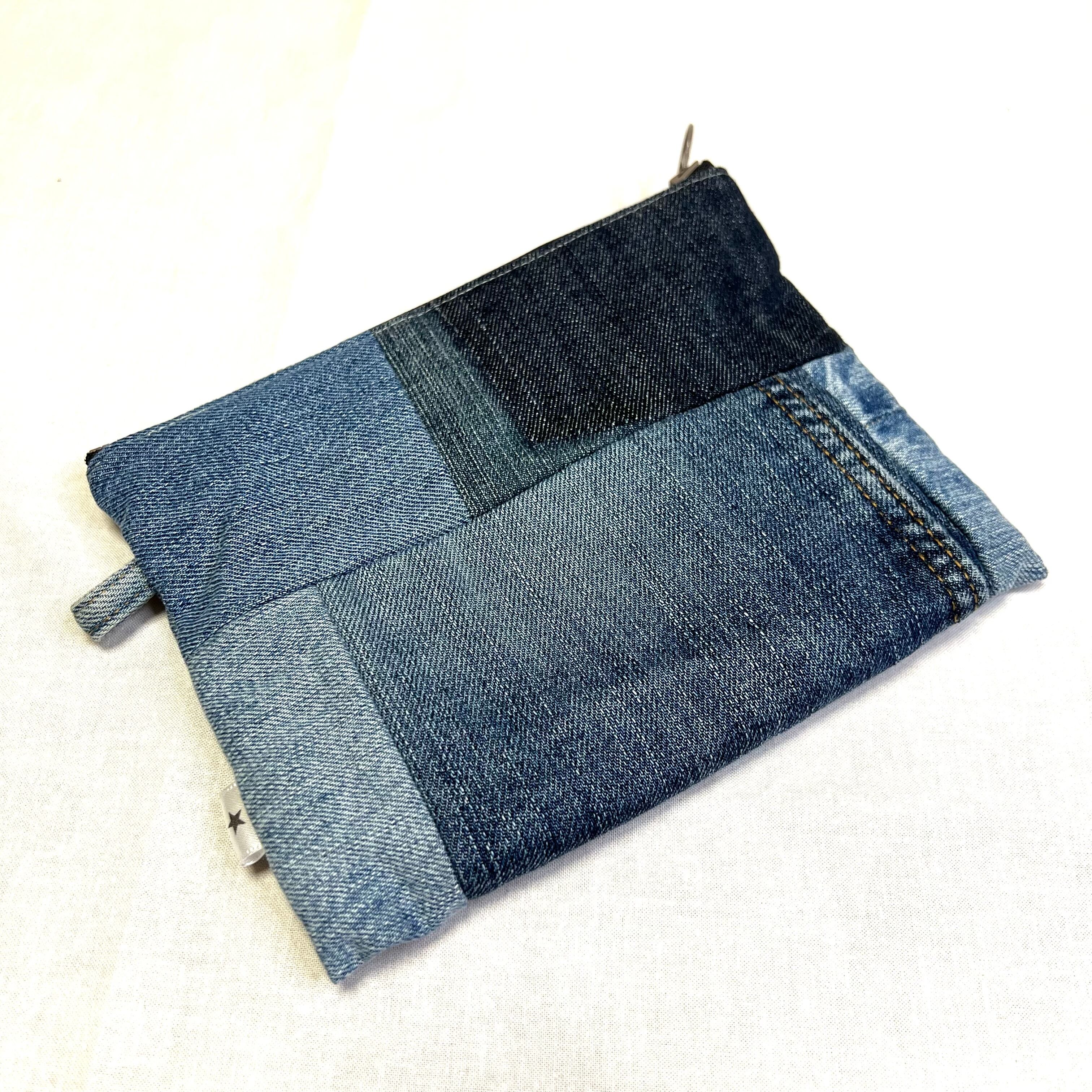 ユーズドのジーンズをリメイクしたフラットポーチです。