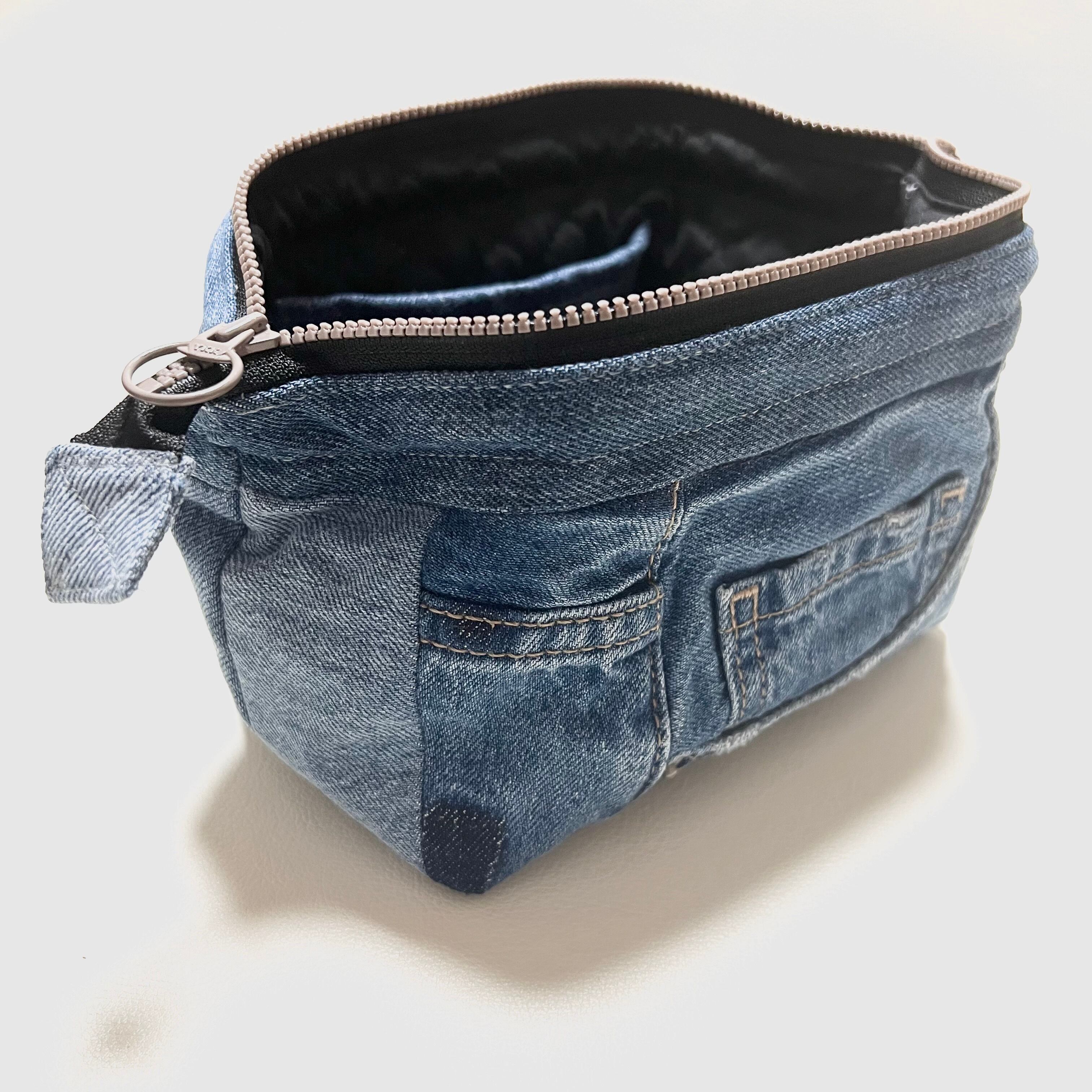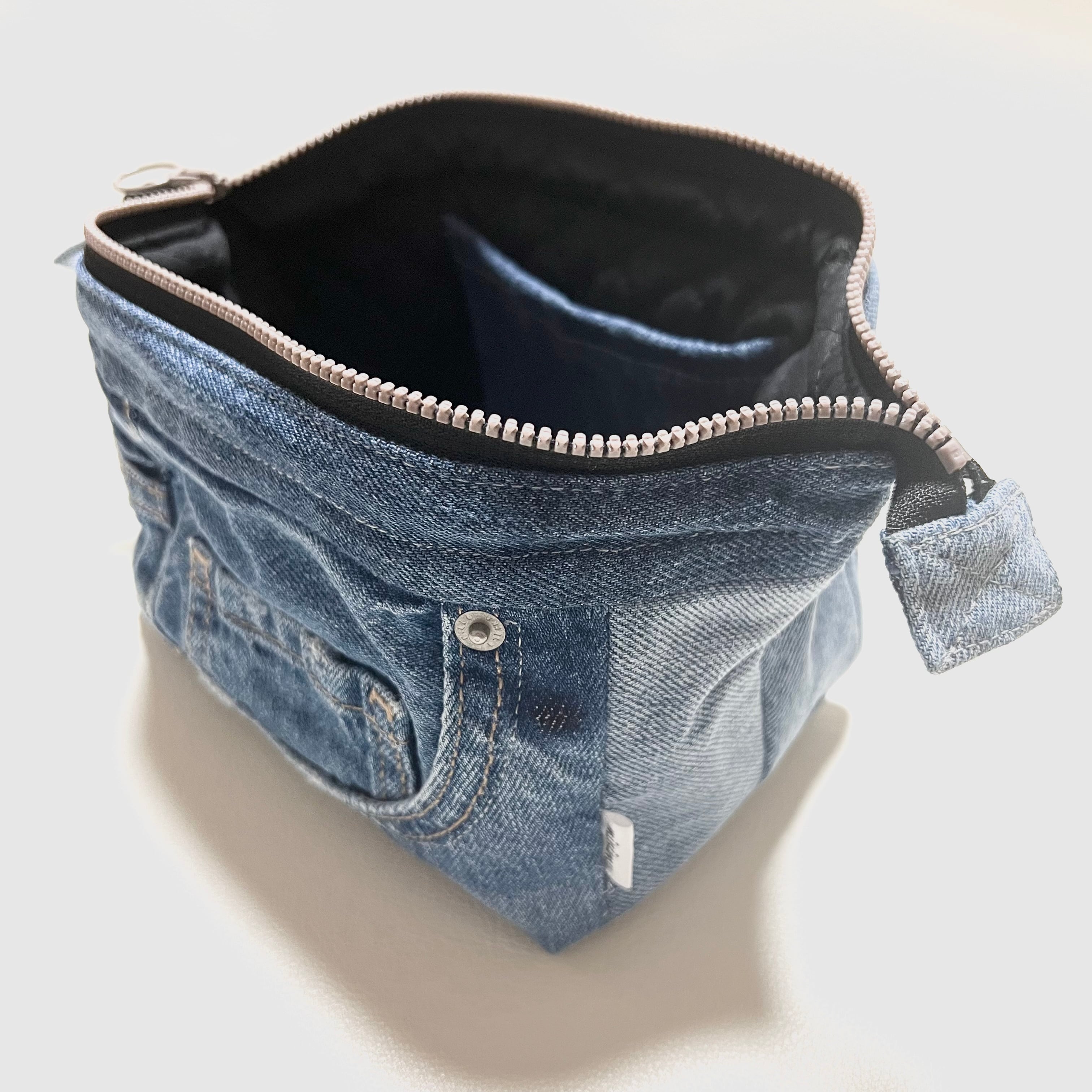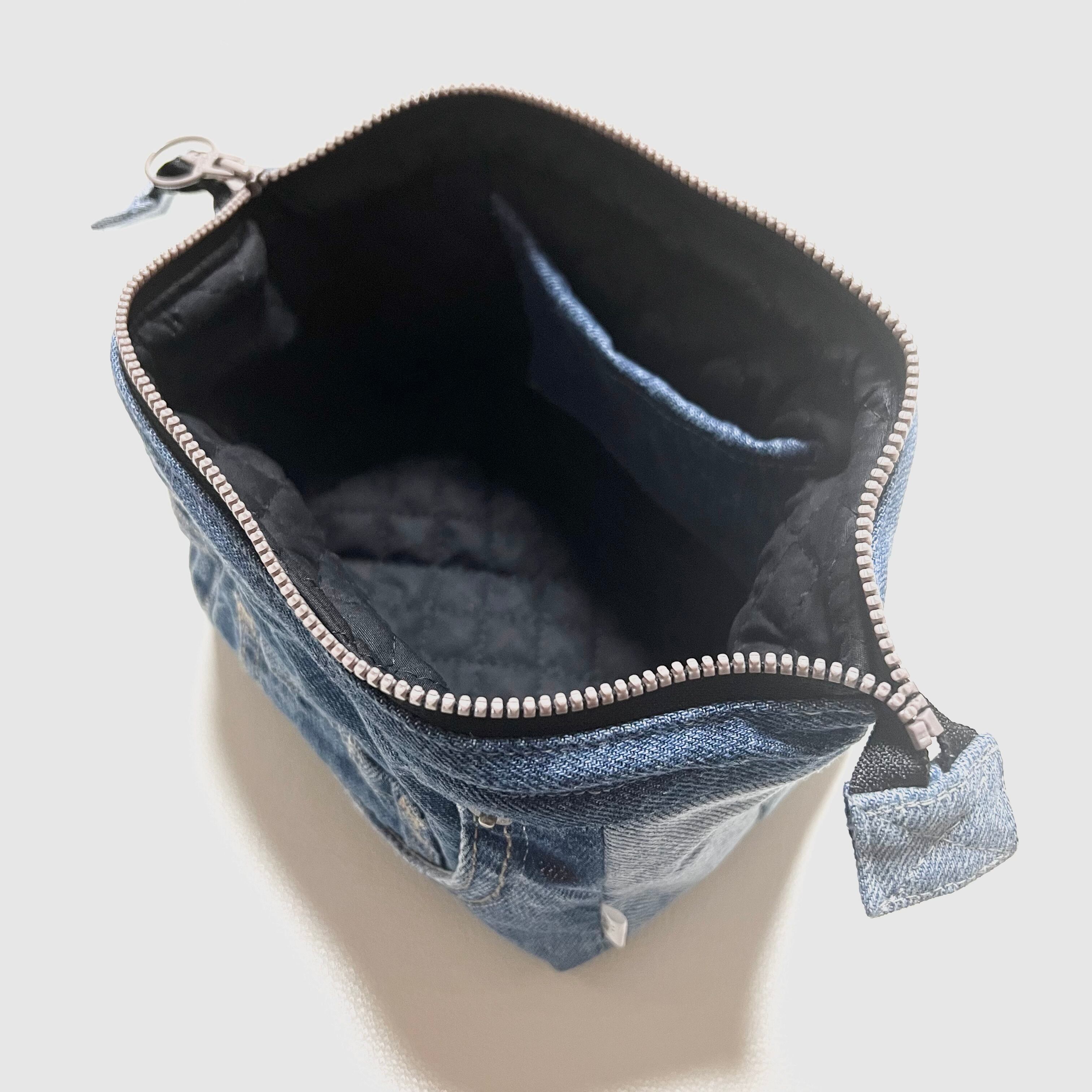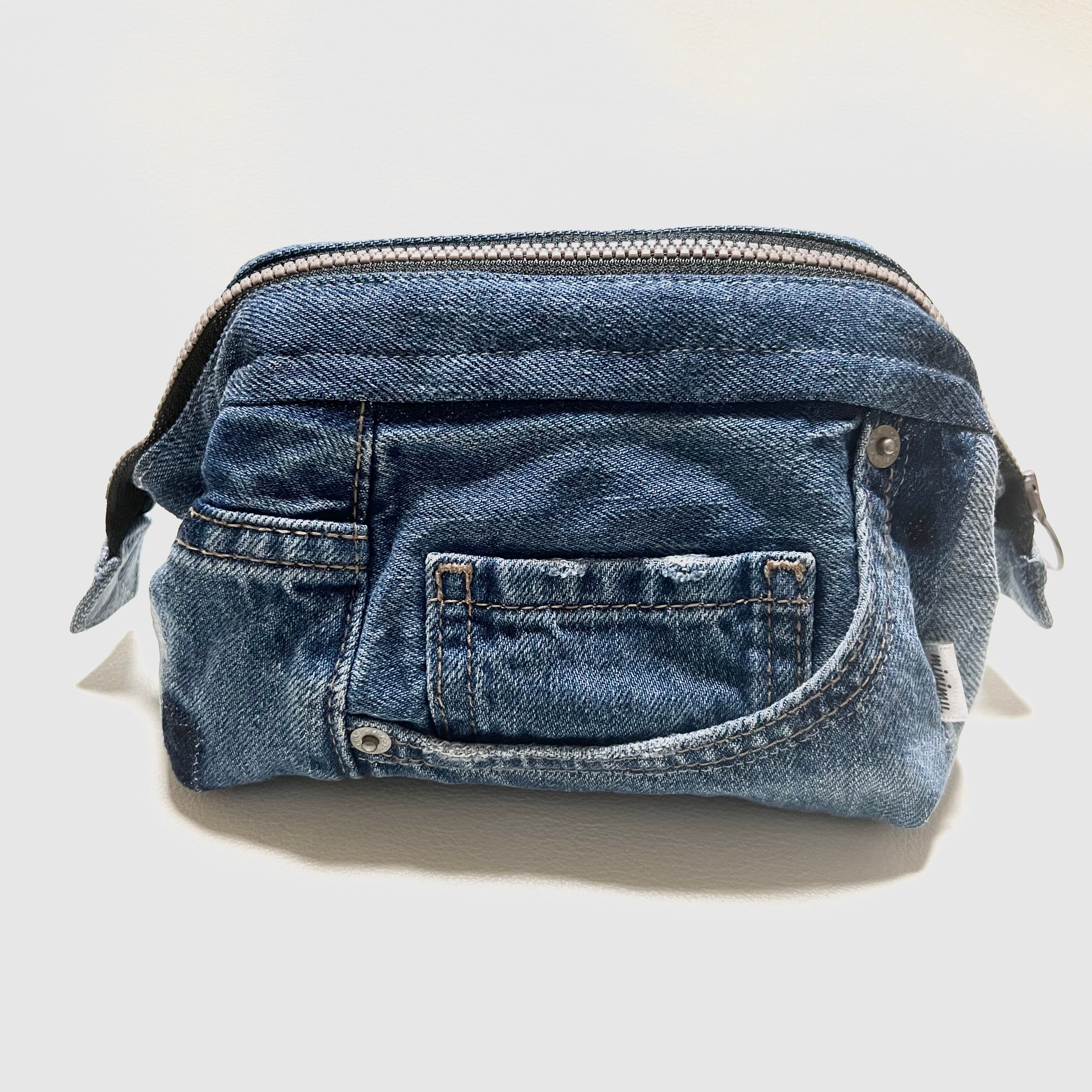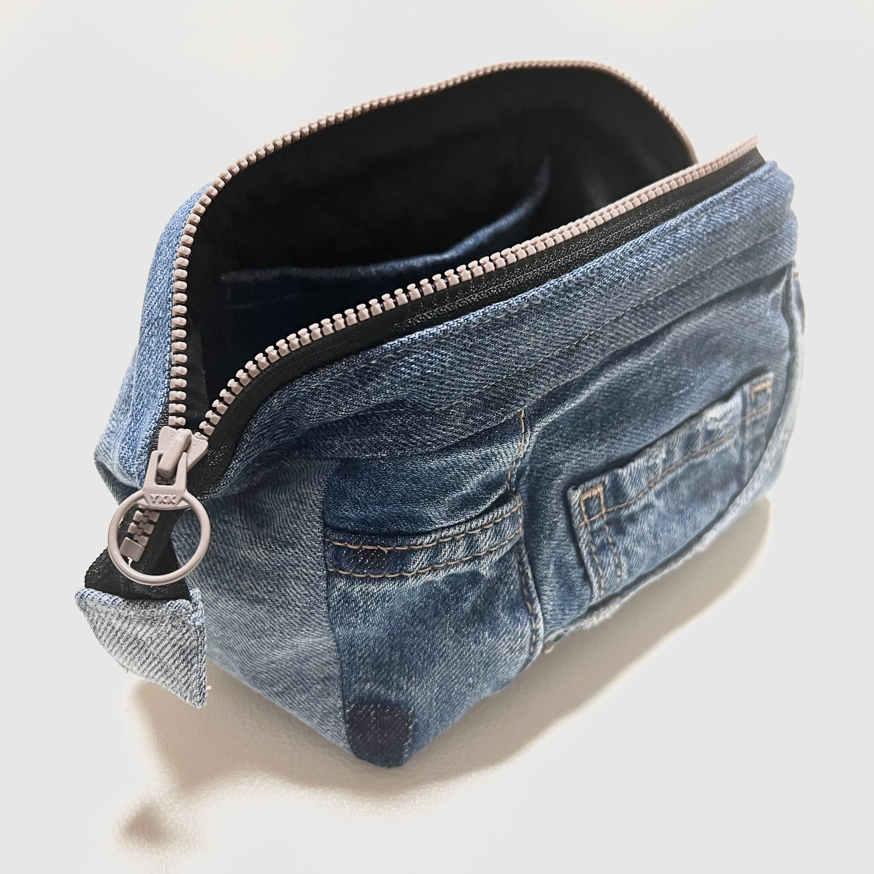 ユーズドのジーンズをリメイクしたワイヤーポーチです。