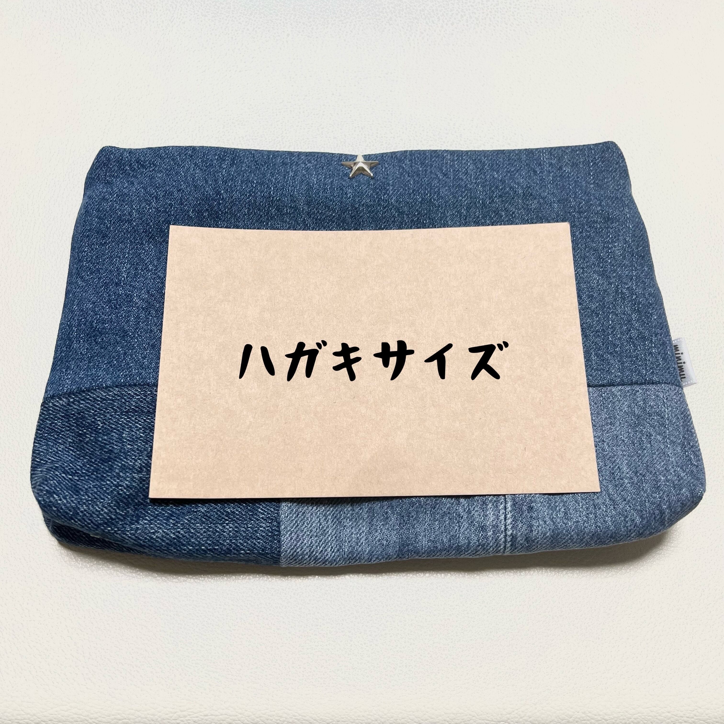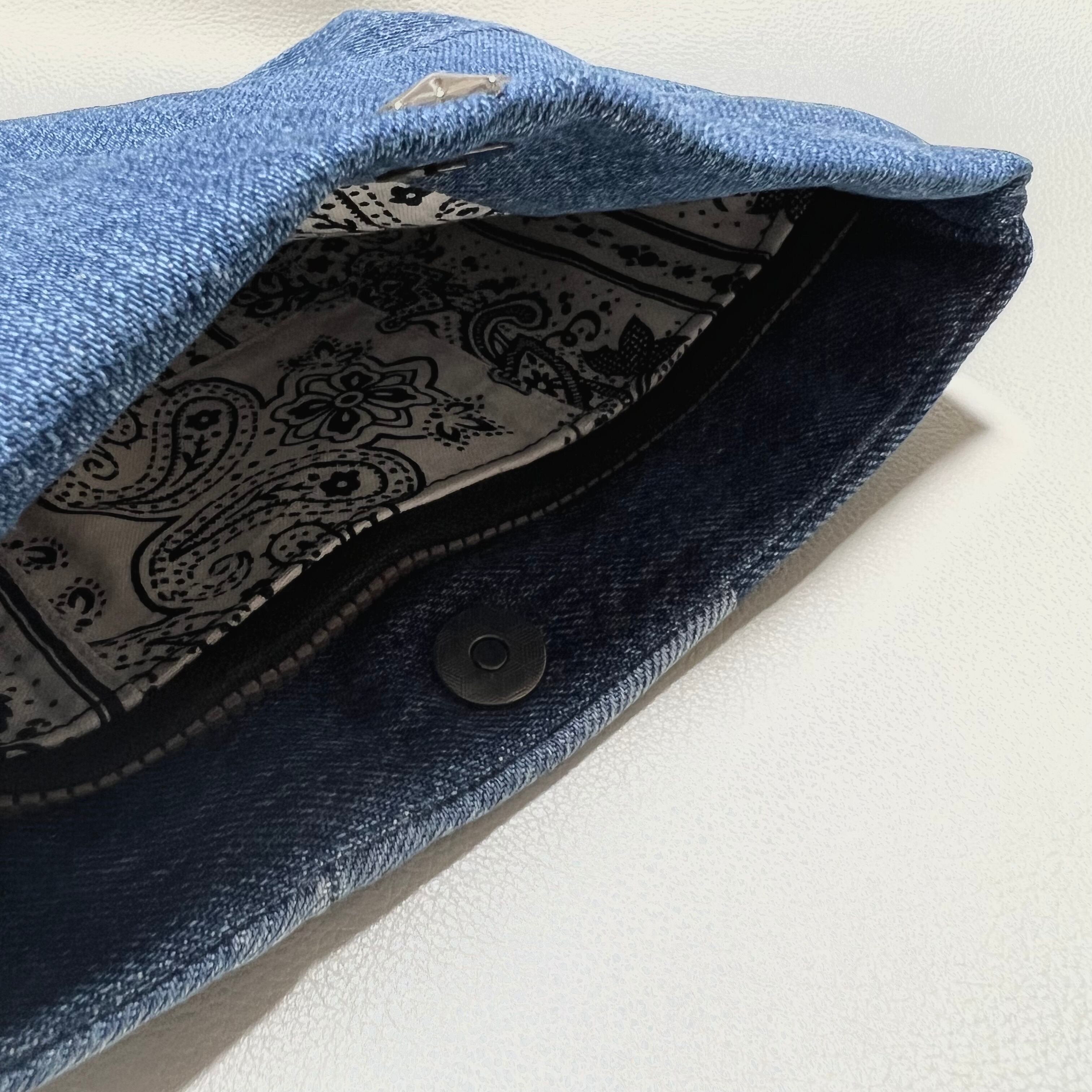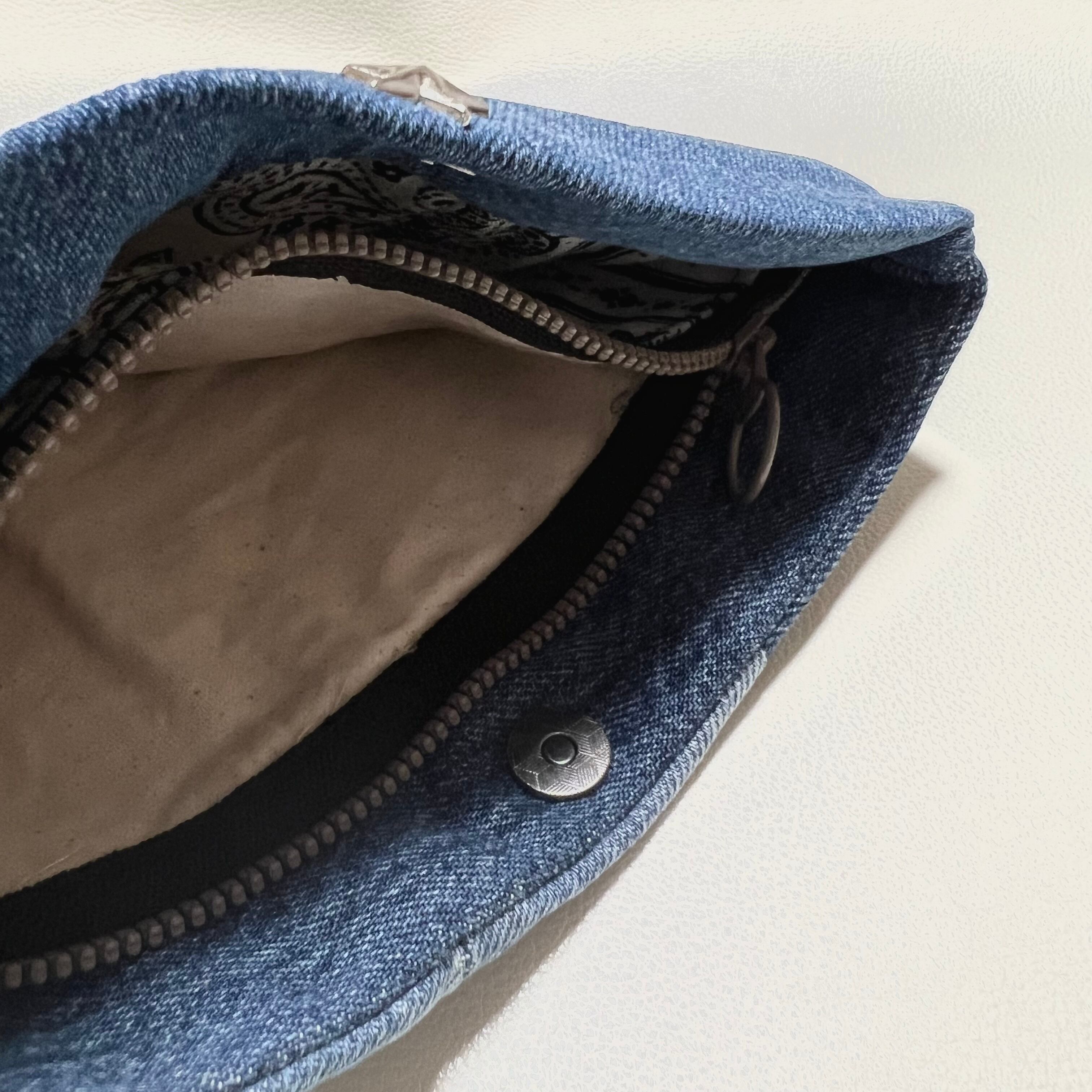 ユーズドのジーンズをリメイクした、オープンポケット2つ・ファスナーポケット1つ、計3つのポケットで中身が仕分けができるマルチケースです。