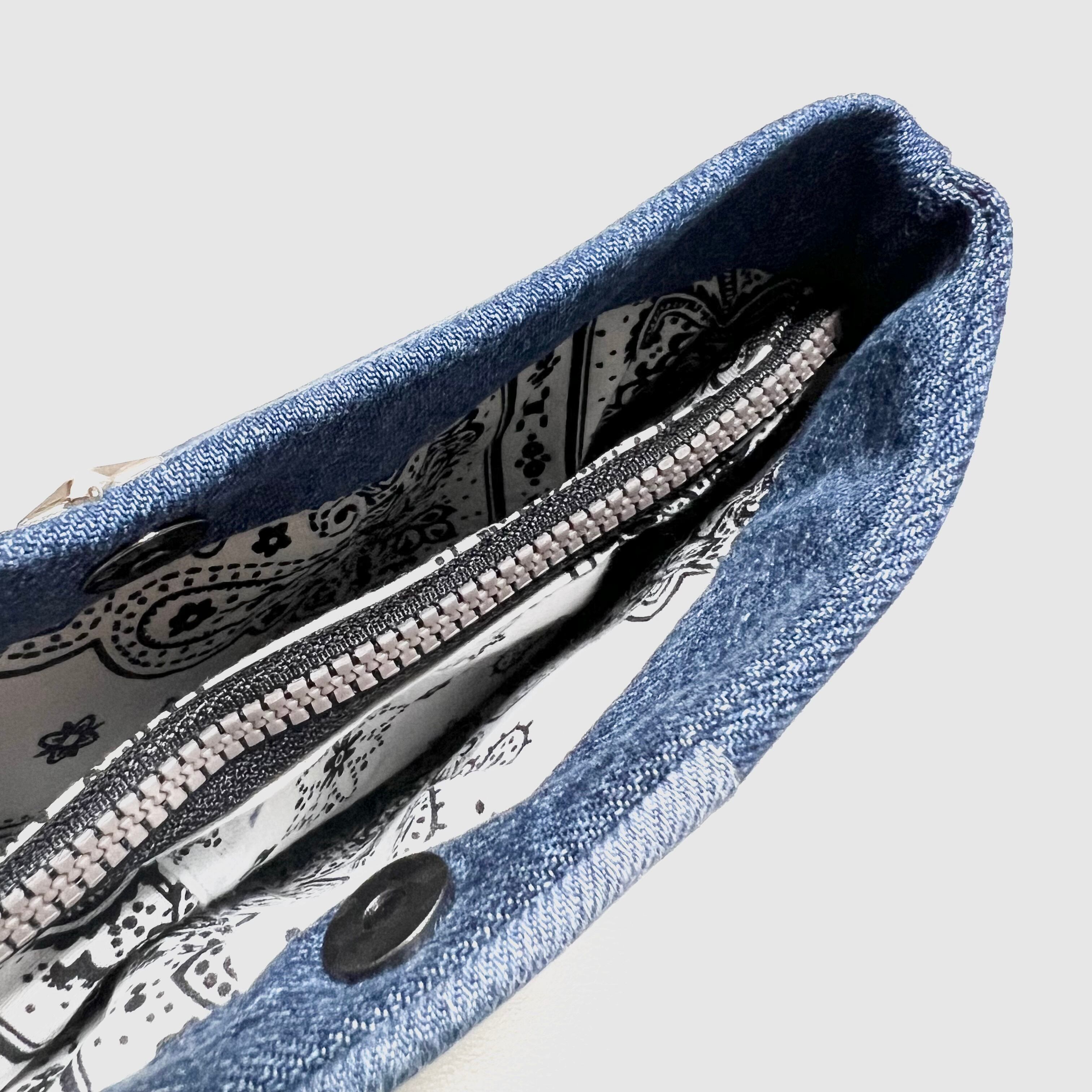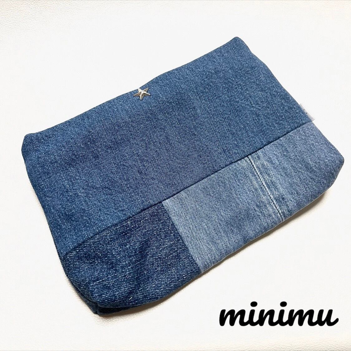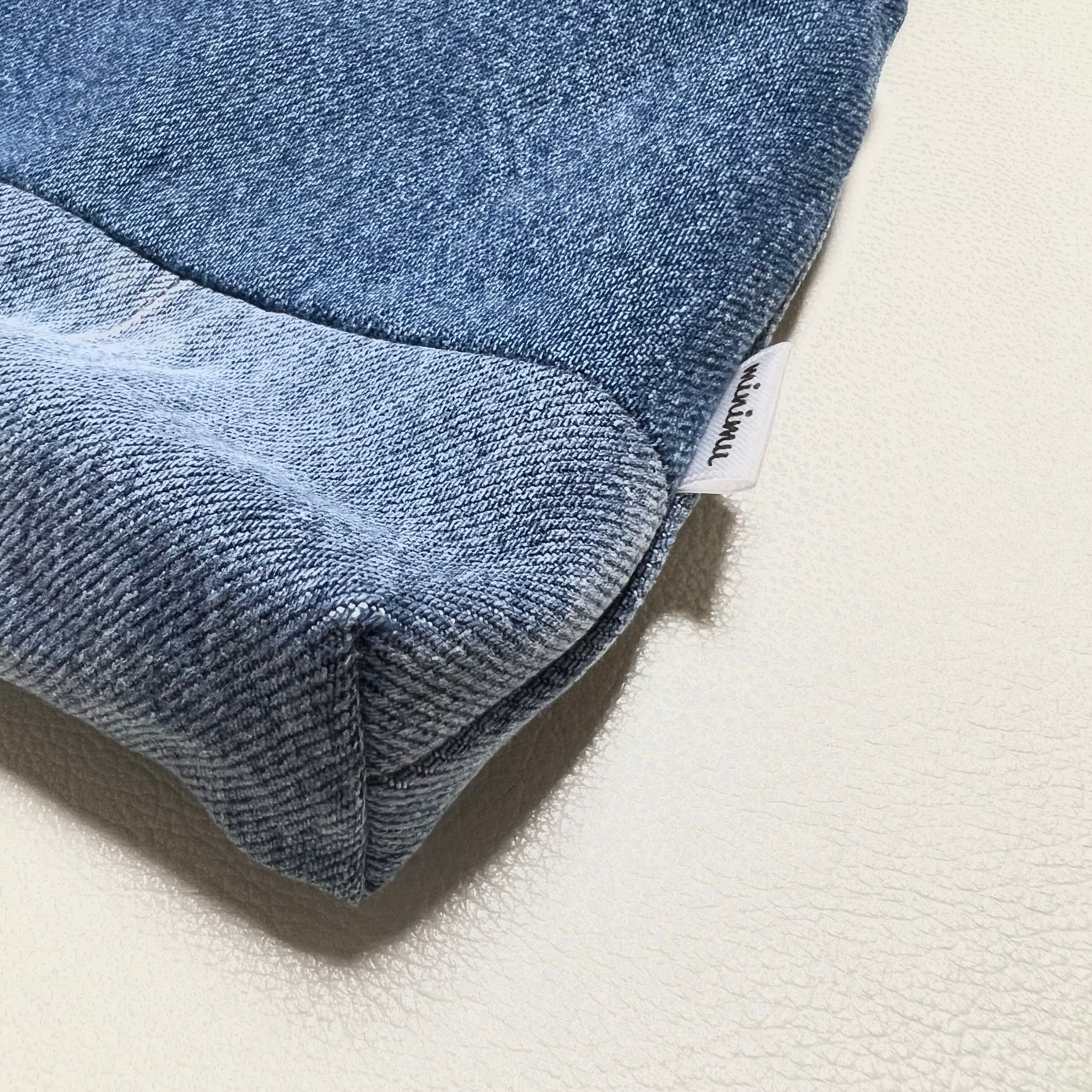 ユーズドのジーンズをリメイクした、オープンポケット2つ・ファスナーポケット1つ、計3つのポケットで中身が仕分けができるマルチケースです。