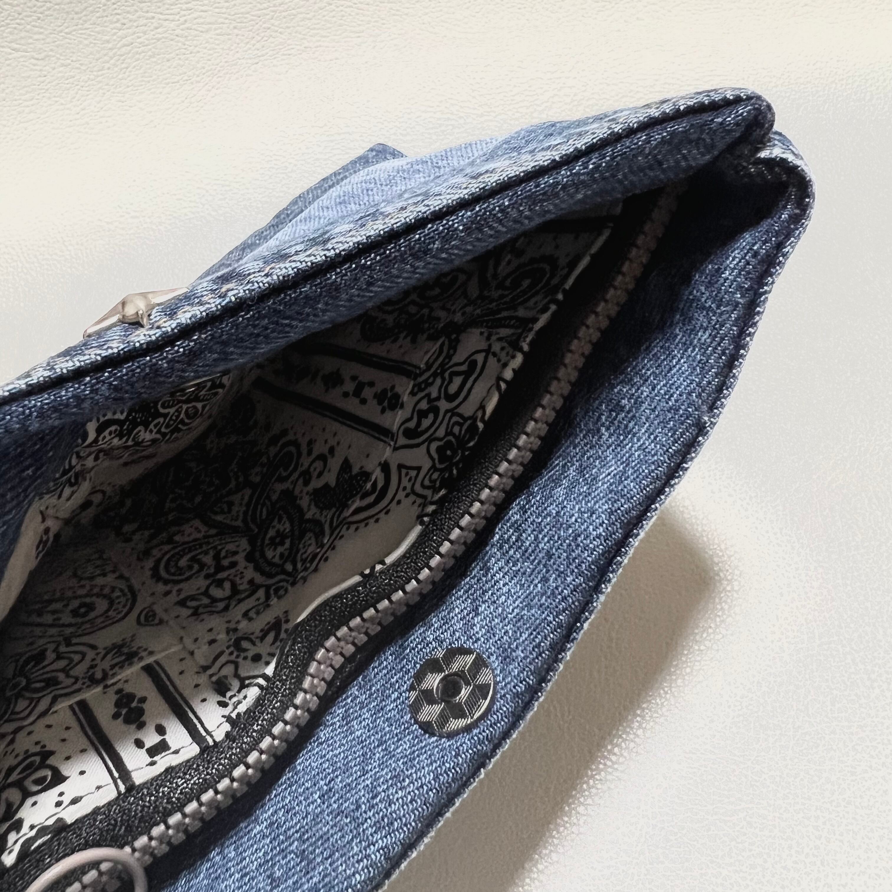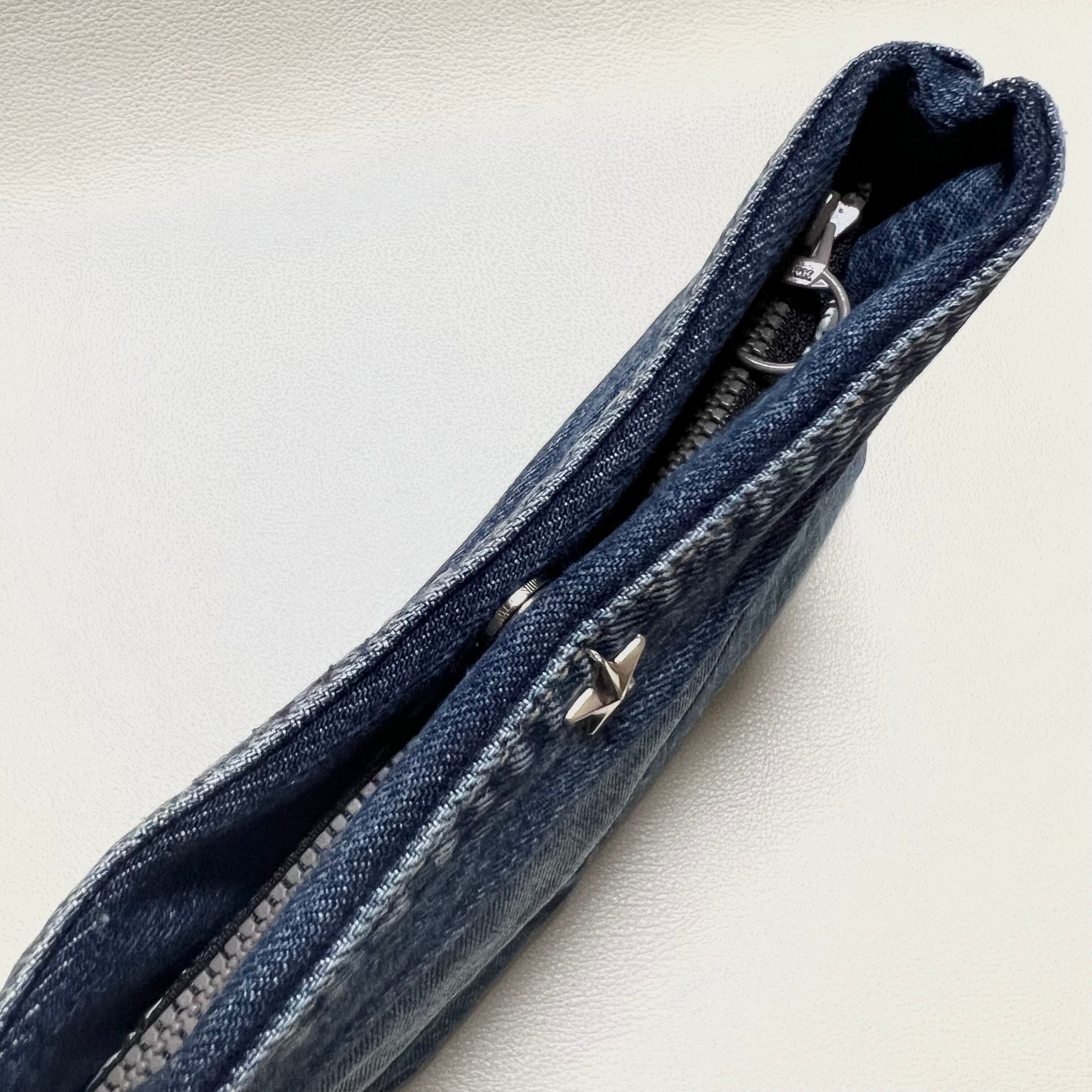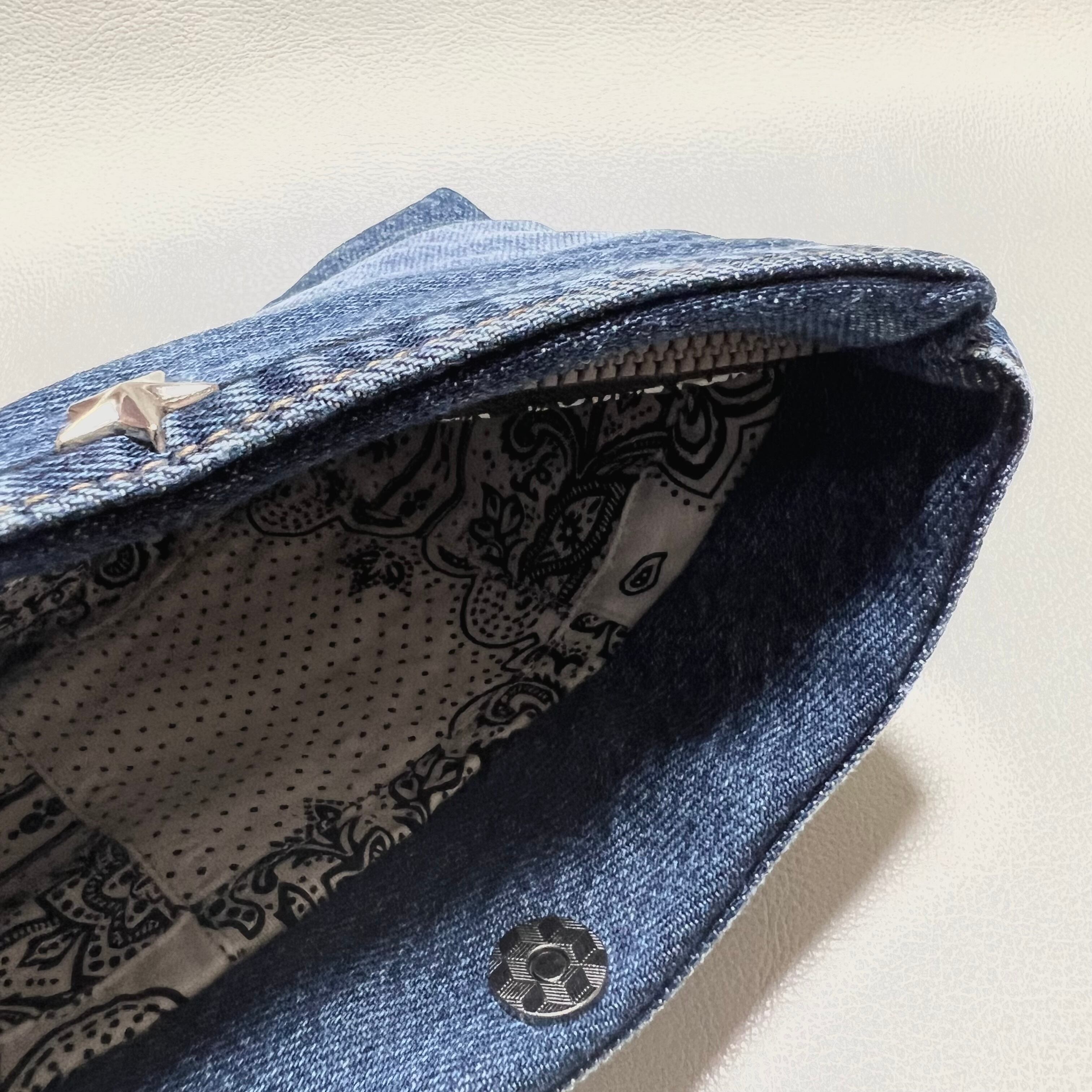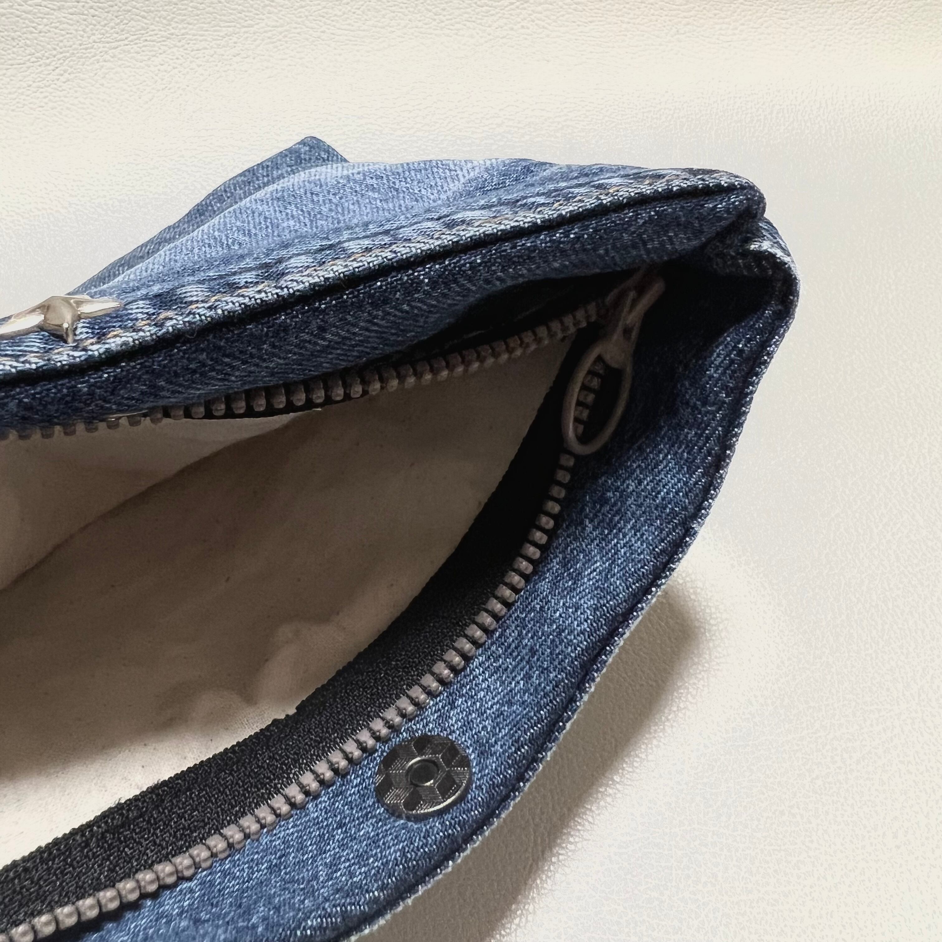 ユーズドのジーンズをリメイクした、オープンポケット2つ・ファスナーポケット1つ、計3つのポケットで中身が仕分けができるマルチケースです。