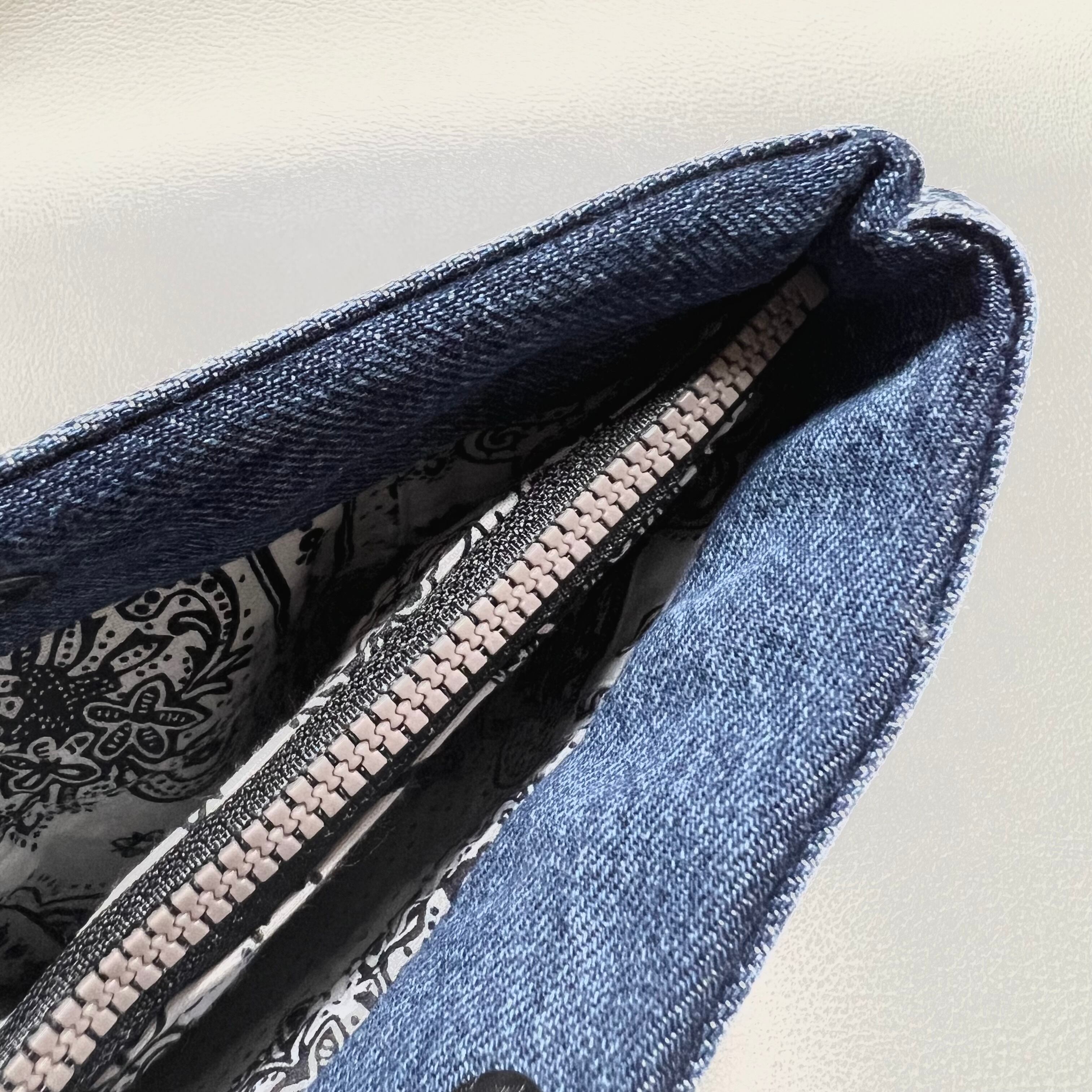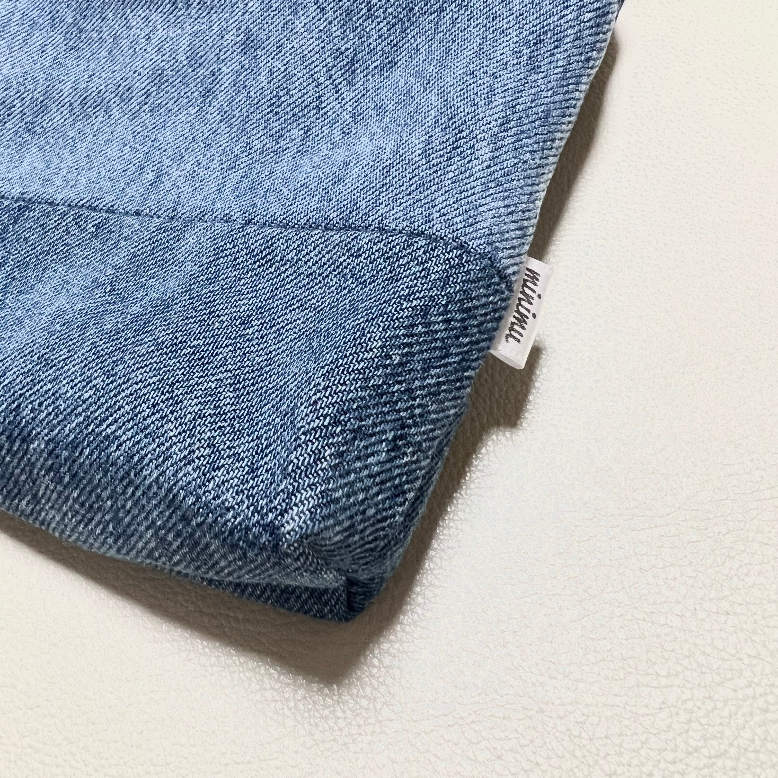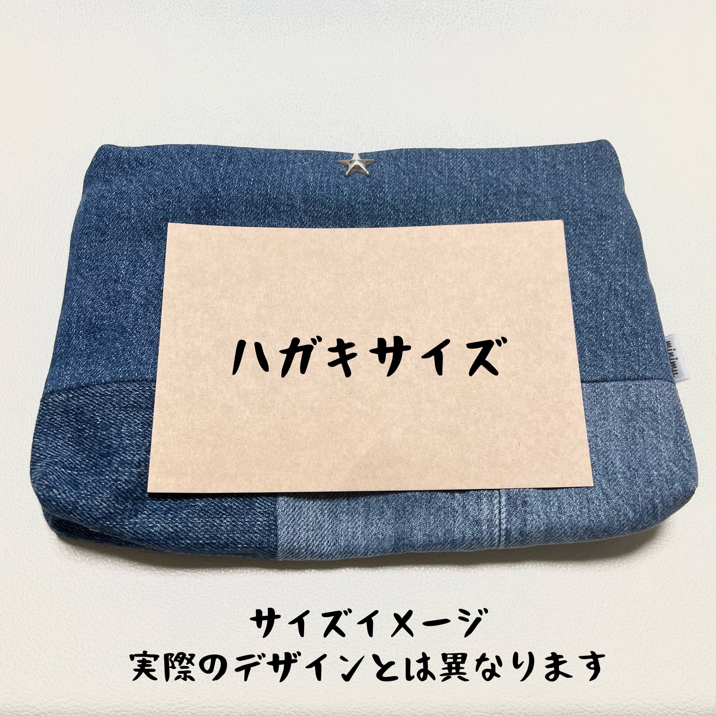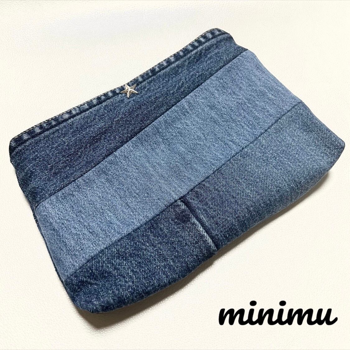ユーズドのジーンズをリメイクした、オープンポケット2つ・ファスナーポケット1つ、計3つのポケットで中身が仕分けができるマルチケースです。