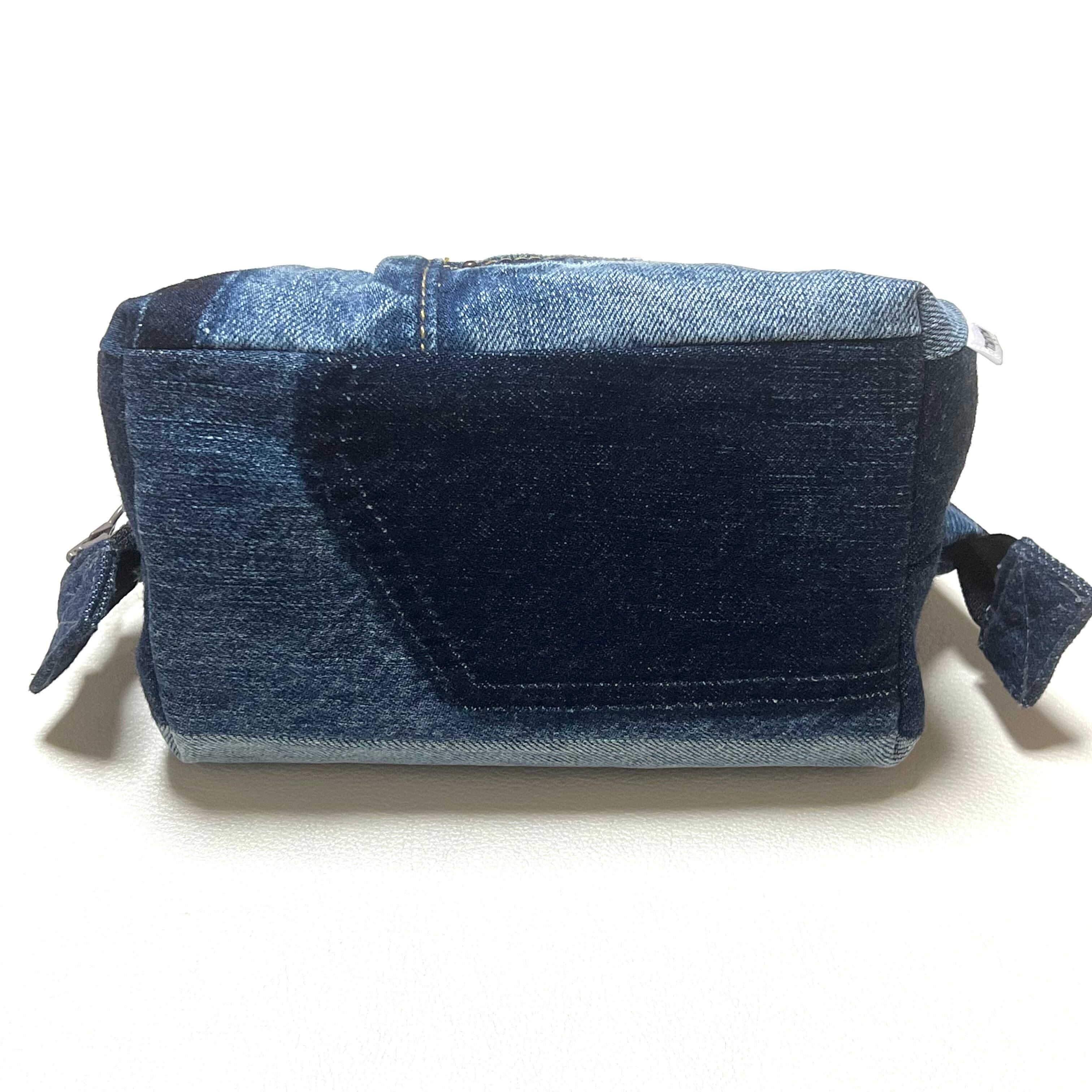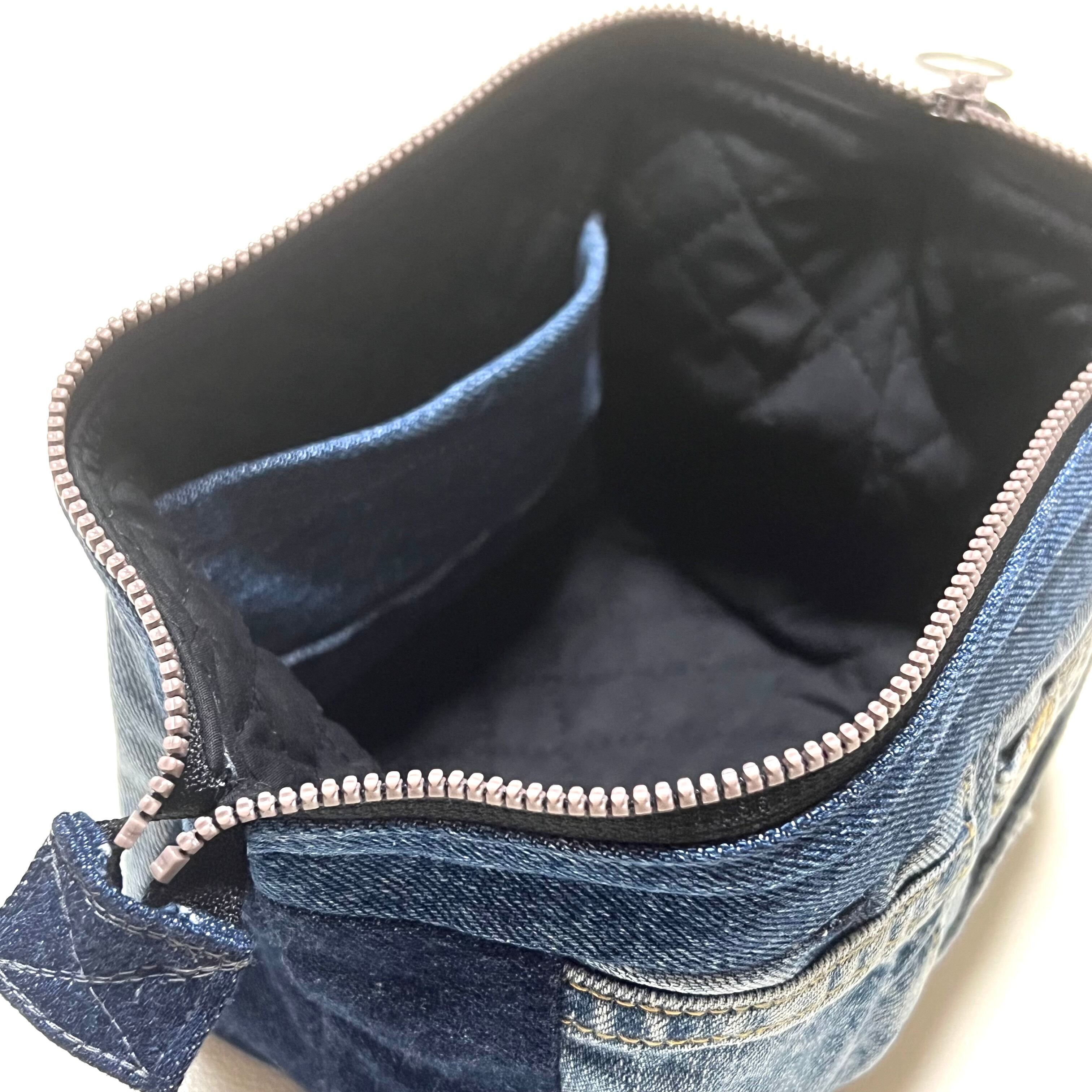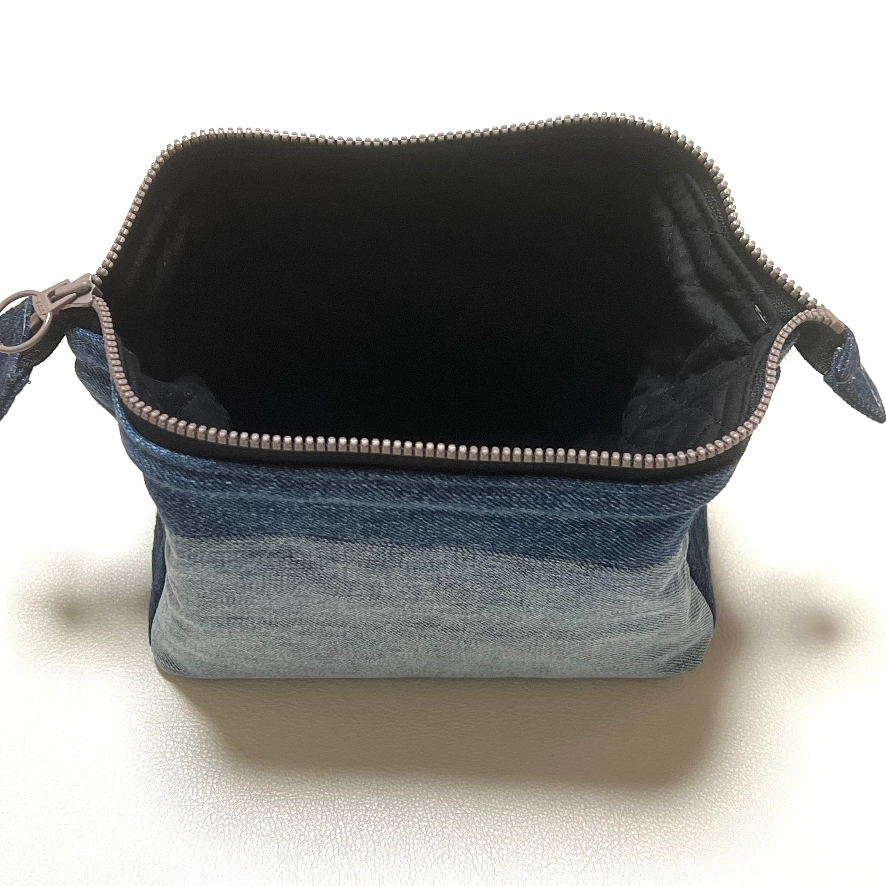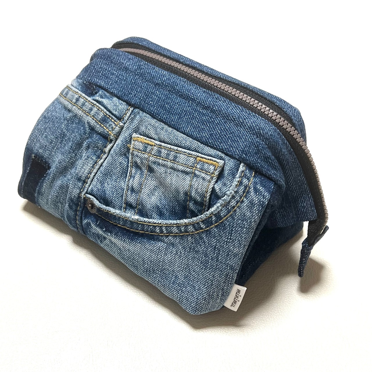 ユーズドのジーンズをリメイクしたワイヤーポーチです。