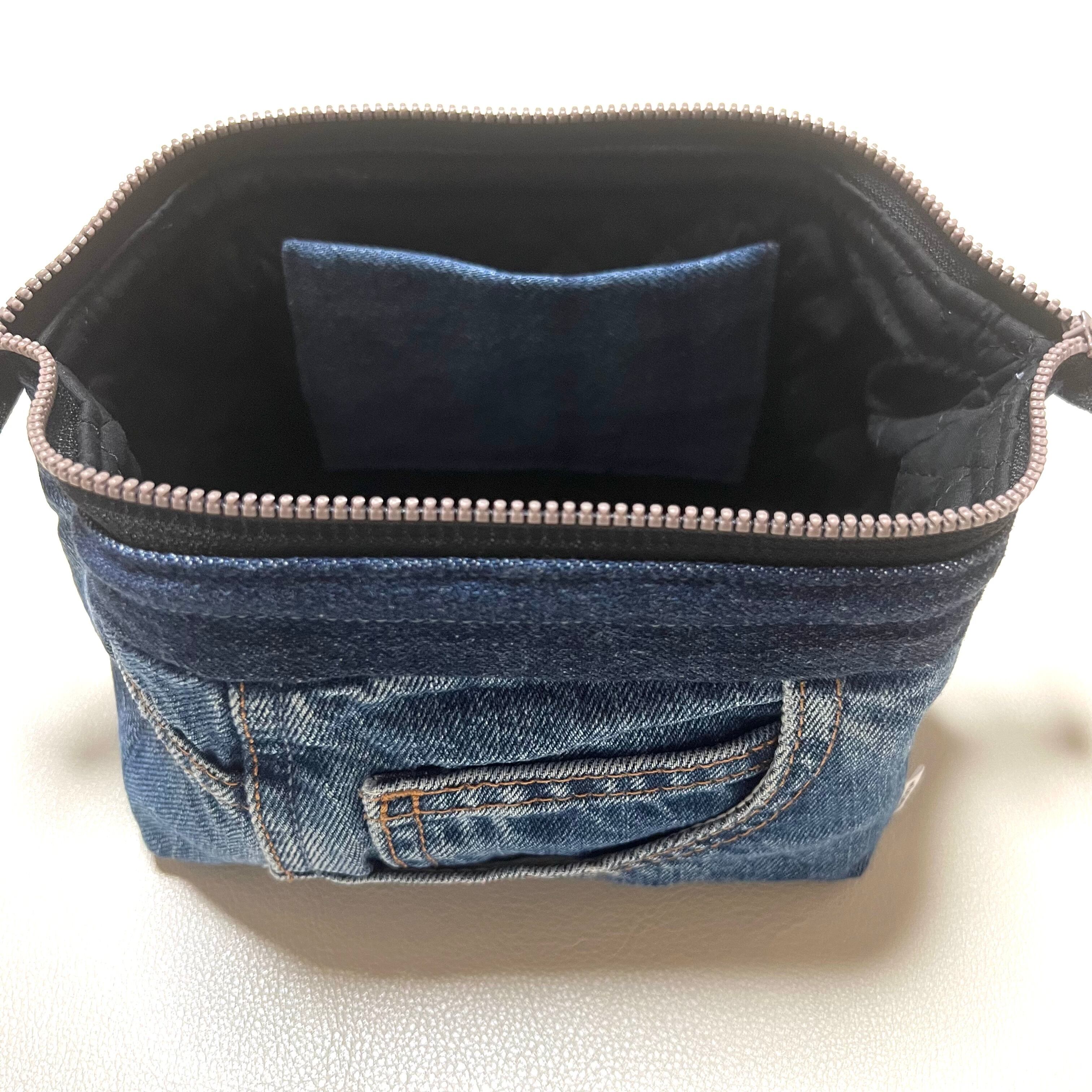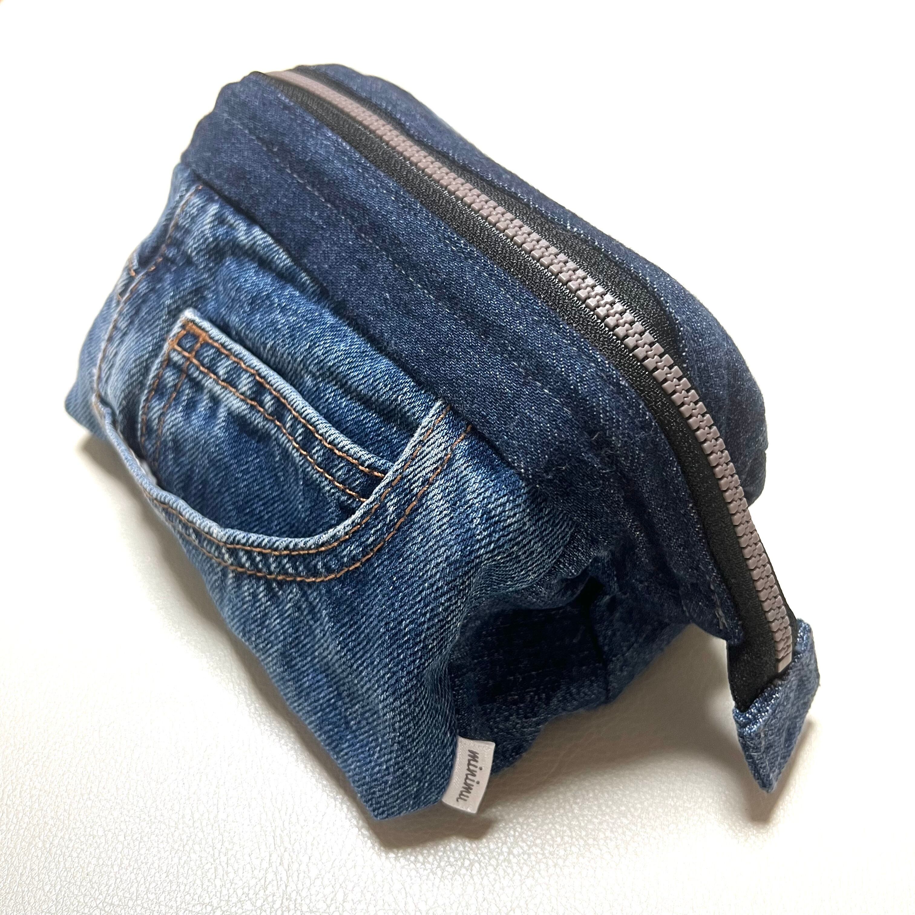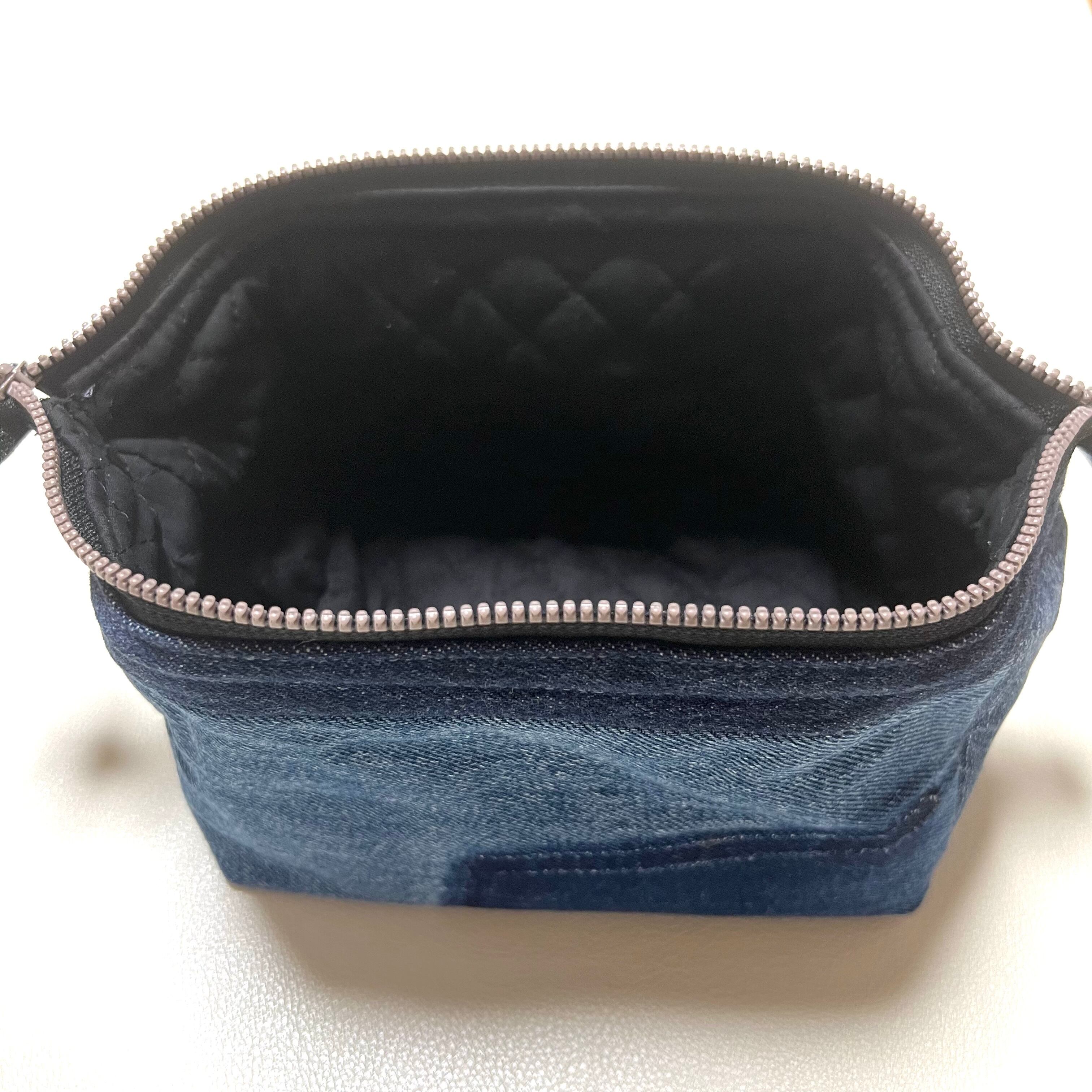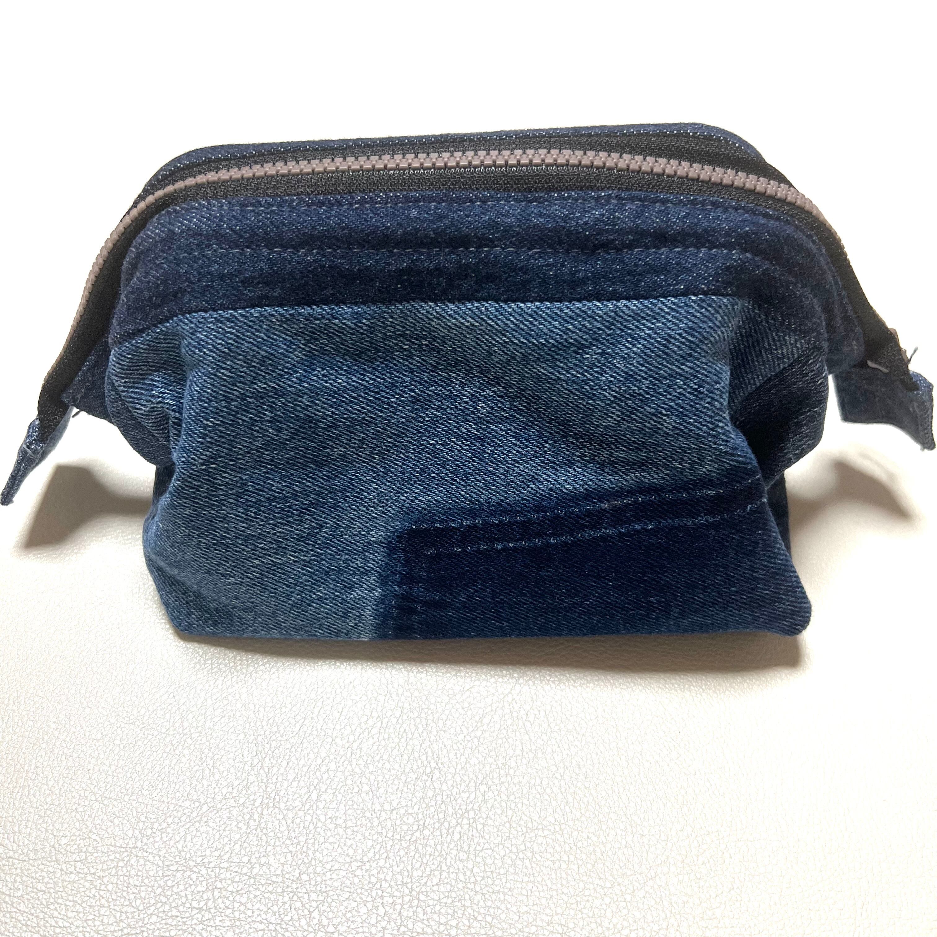 ユーズドのジーンズをリメイクしたワイヤーポーチです。