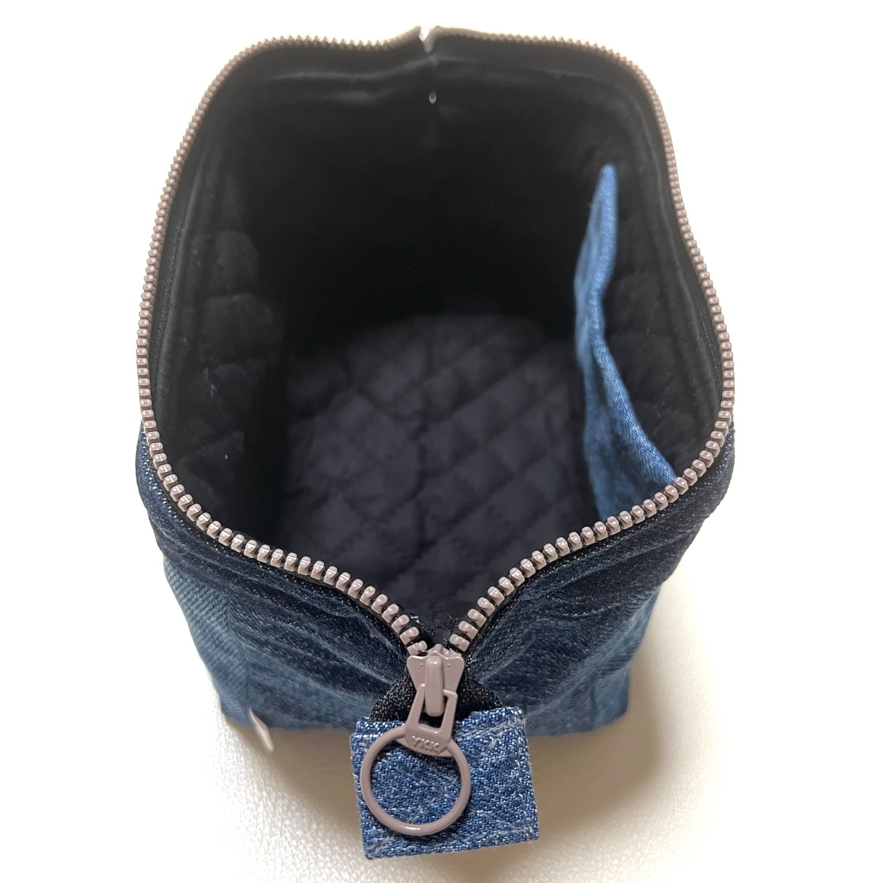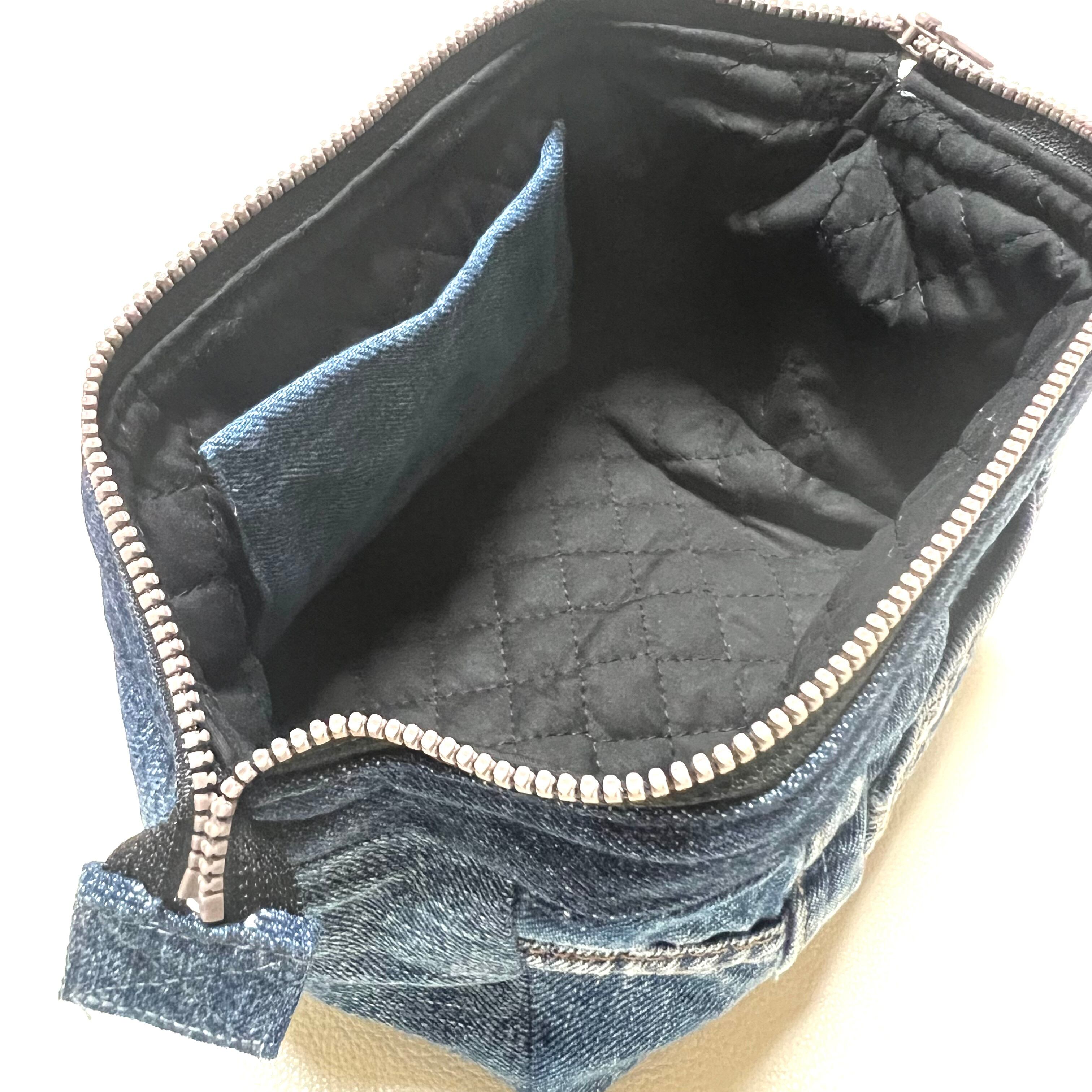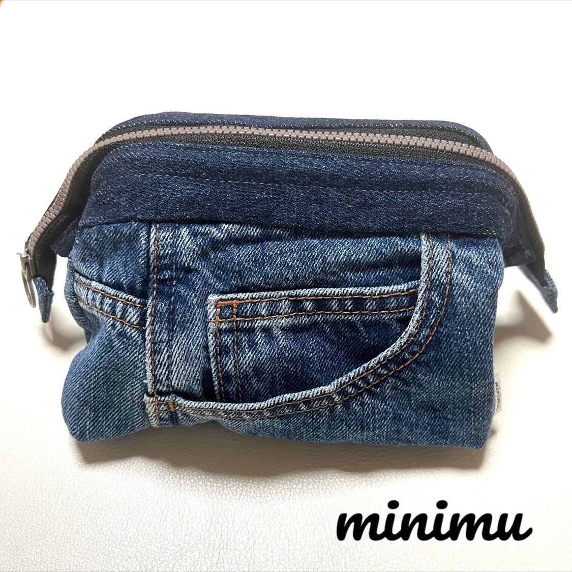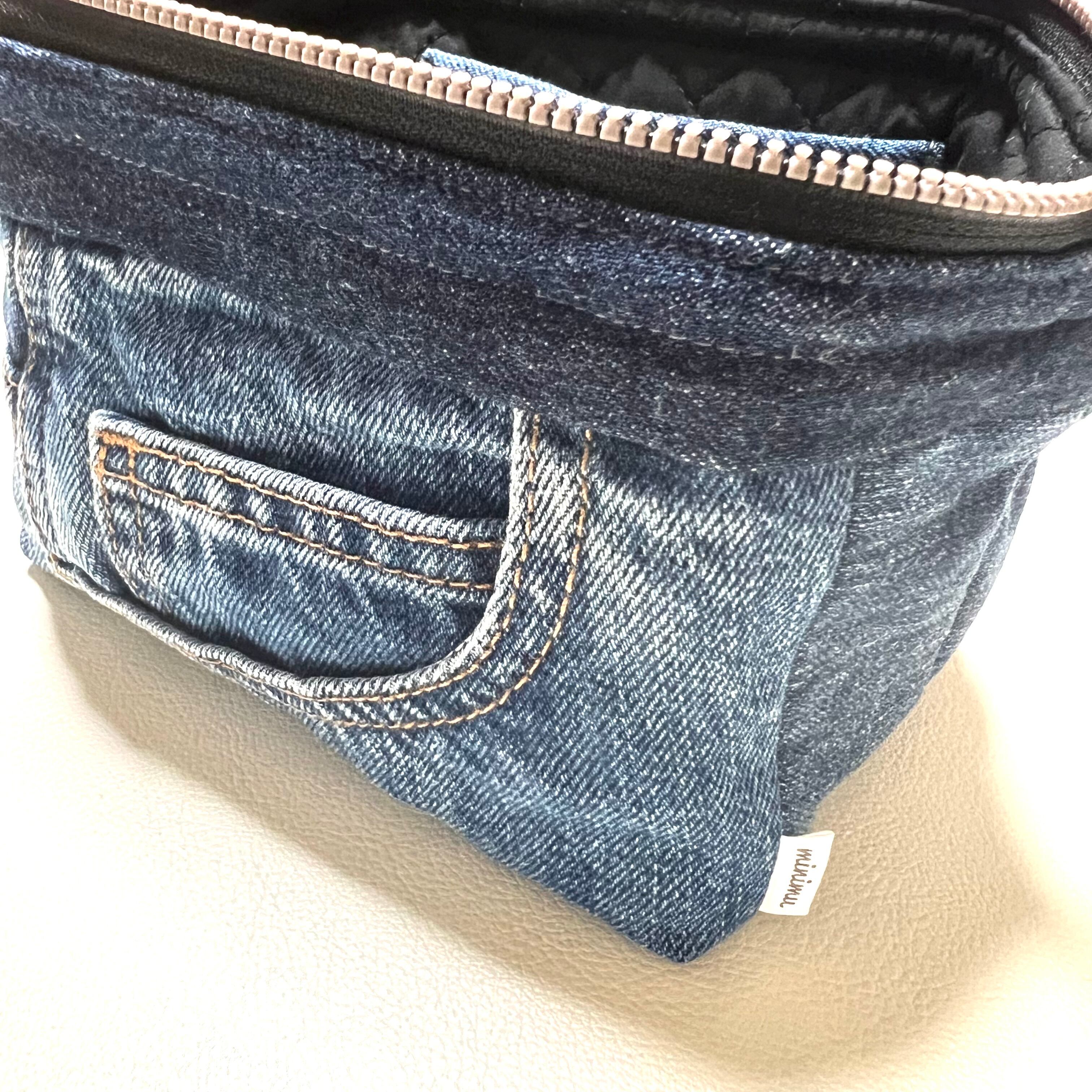 ユーズドのジーンズをリメイクしたワイヤーポーチです。