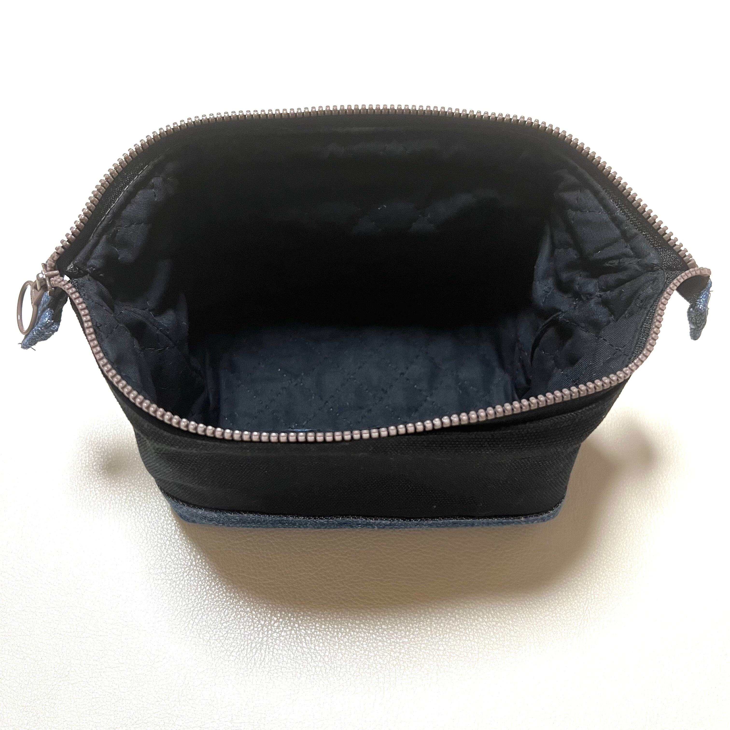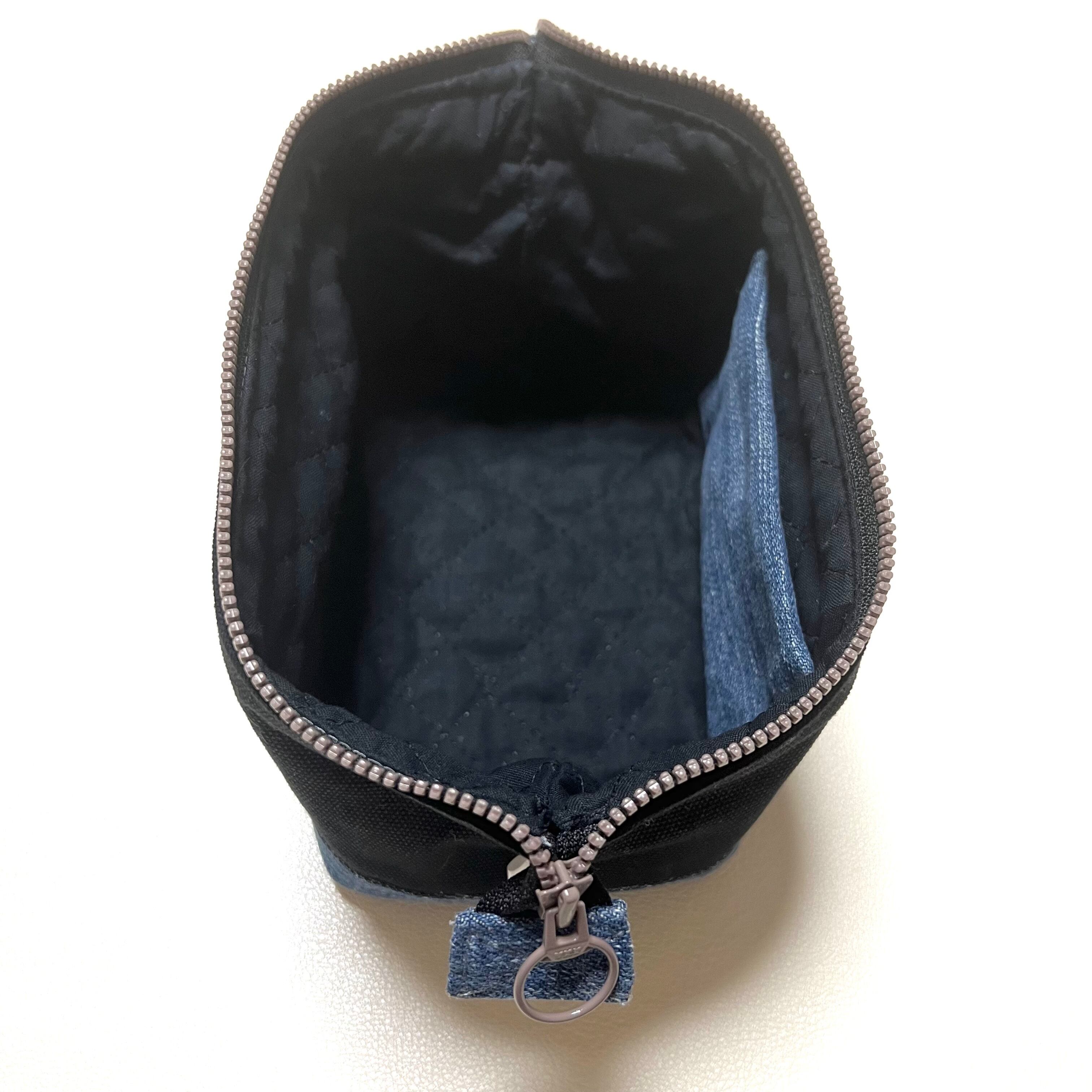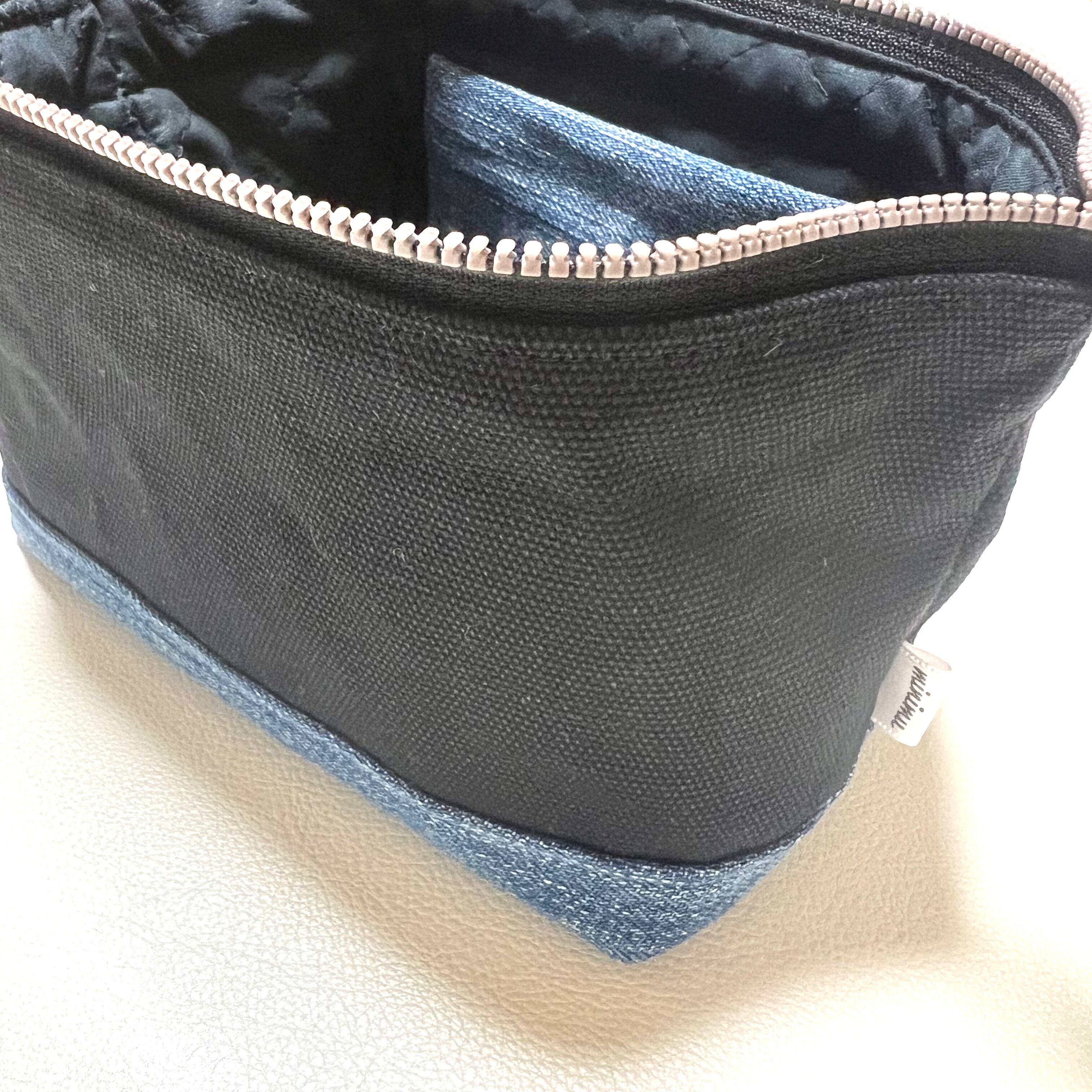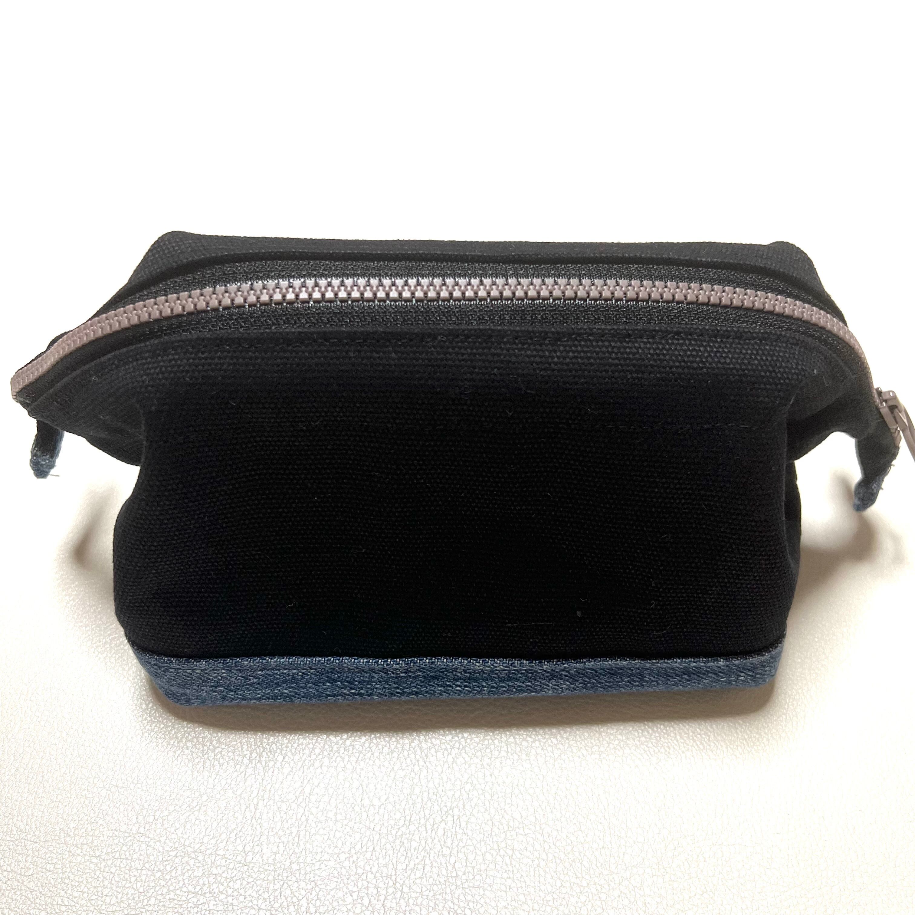 ユーズドのジーンズをリメイクし、帆布と合わせたワイヤーポーチです。
