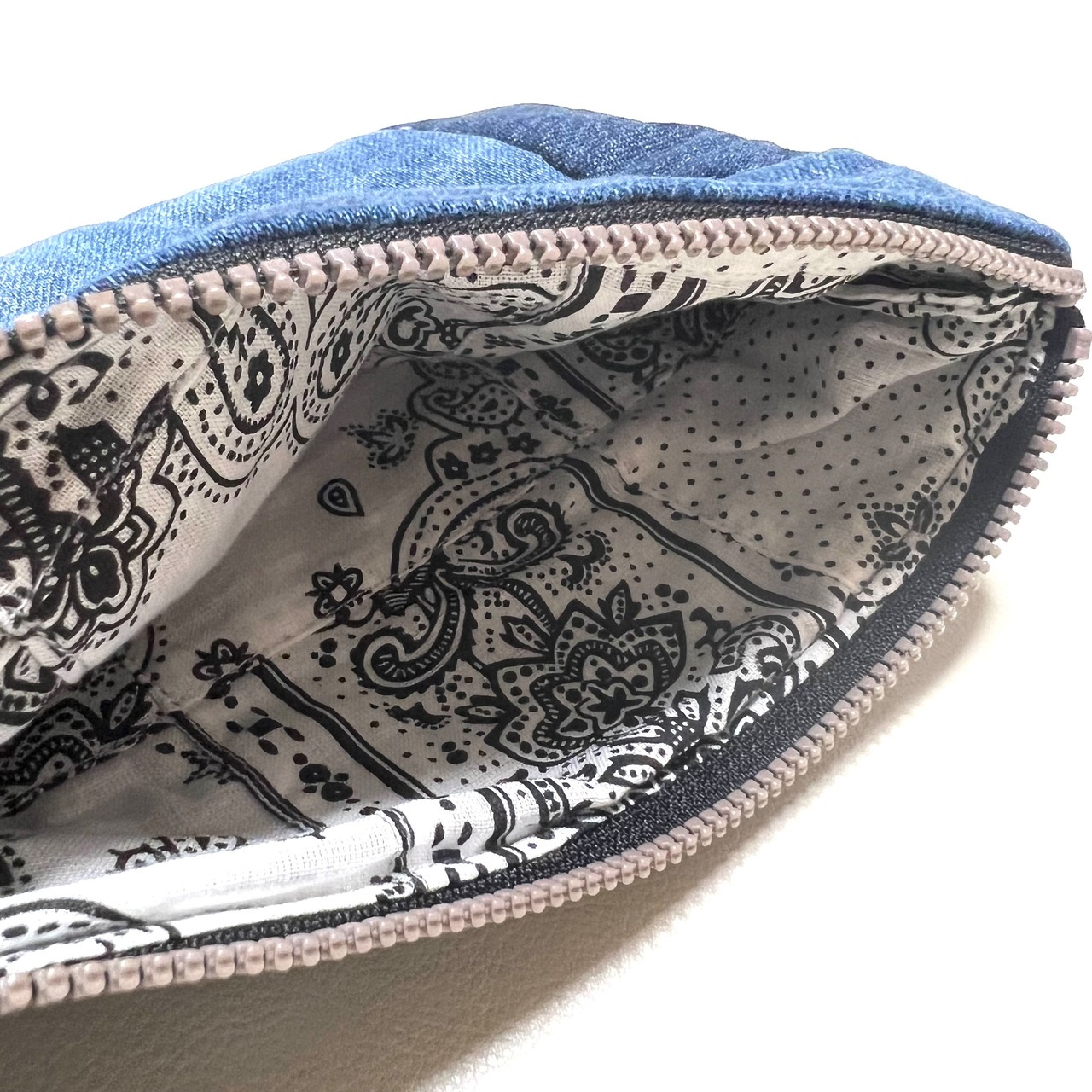 ユーズドのジーンズをリメイクしたフラットポーチです。